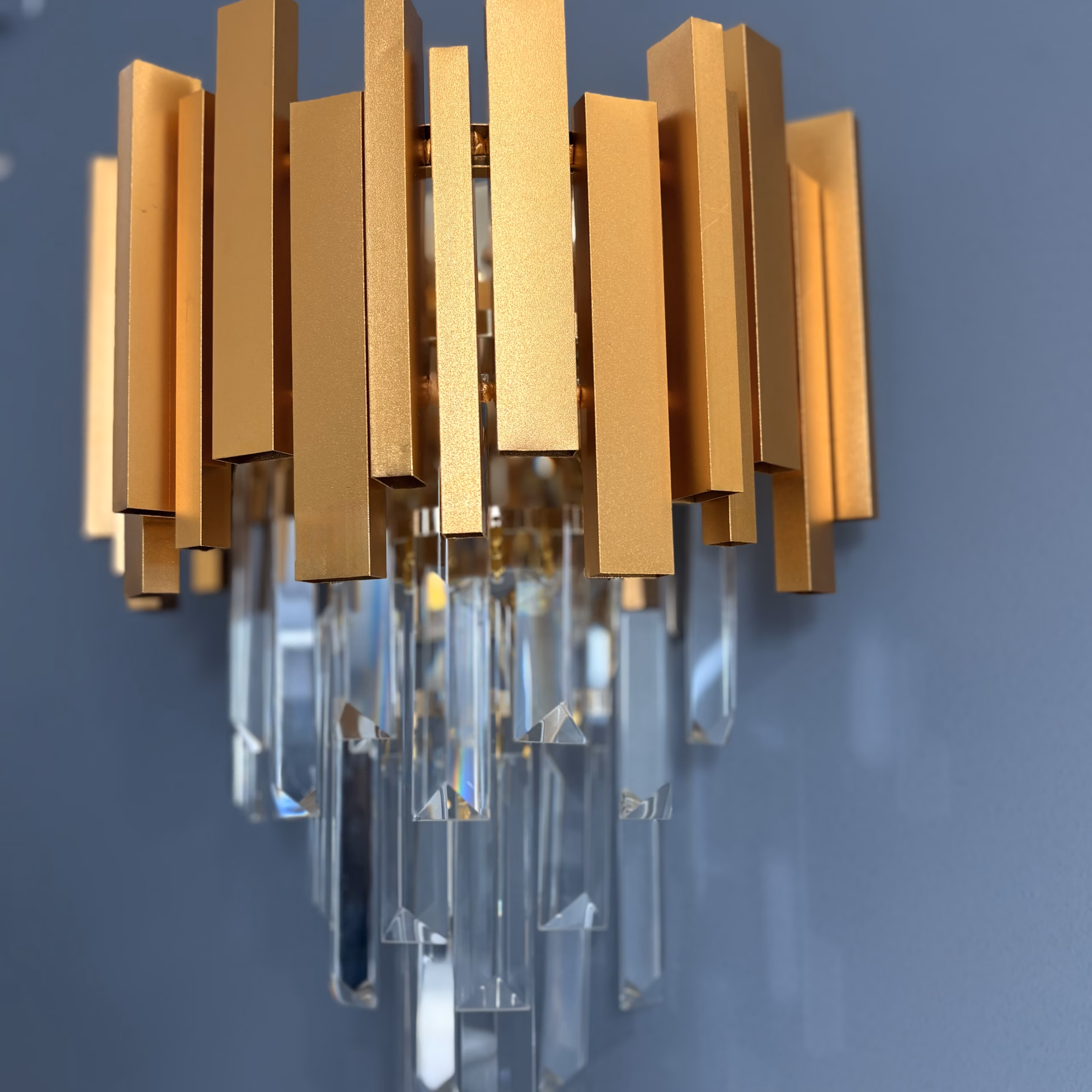 O aplică modernă și elegantă, cu structură aurie și cristale prismatice fațetate. Ideală pentru living, hol, dormitor sau spații premium, unde adaugă lumină caldă și accente sofisticate.