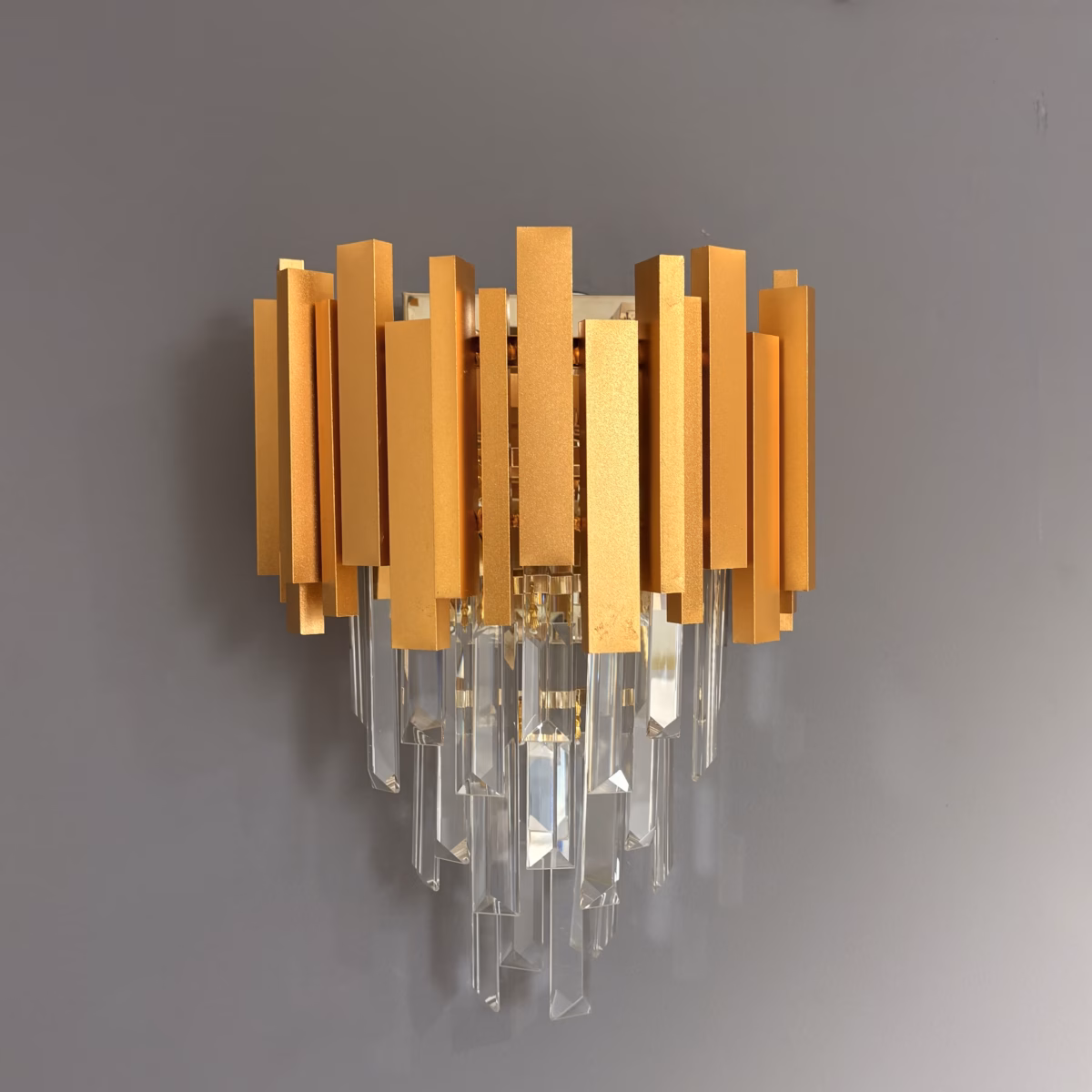 Aplica Modern Prism Gold – Grand Edition îmbină designul contemporan cu strălucirea luxului modern. Barele verticale din metal auriu satinat creează un aspect architectural puternic, iar cristalele lungi tip prismă reflectă lumina într-un joc spectaculos de străluciri.