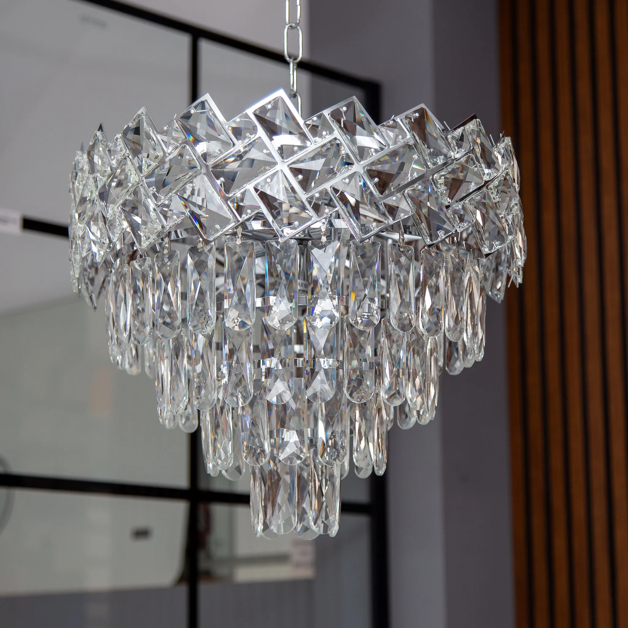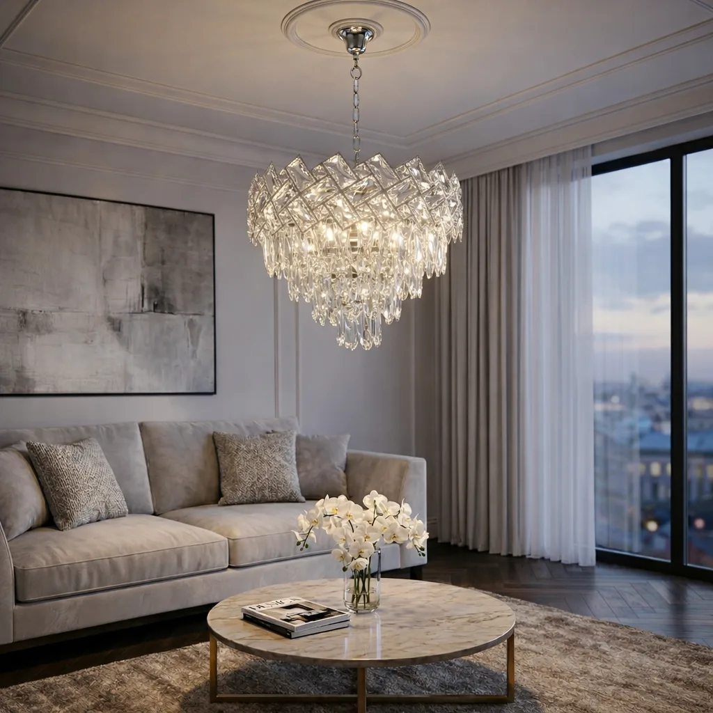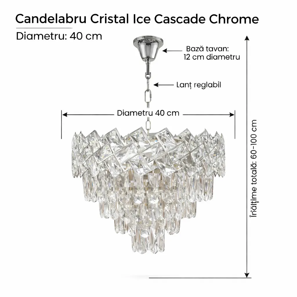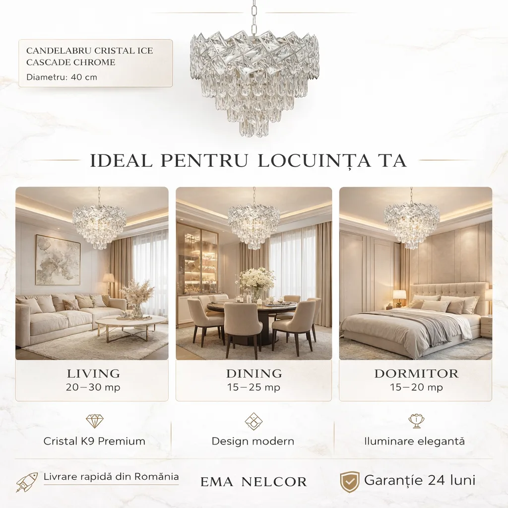 Pentru a pune în valoare reflexiile reci și curate ale cromului, recomandăm becuri LED cu lumină neutră (4000K). Aceasta va face ca fiecare cristal K9 să strălucească precum gheața sub soare, oferind camerei o claritate modernă.