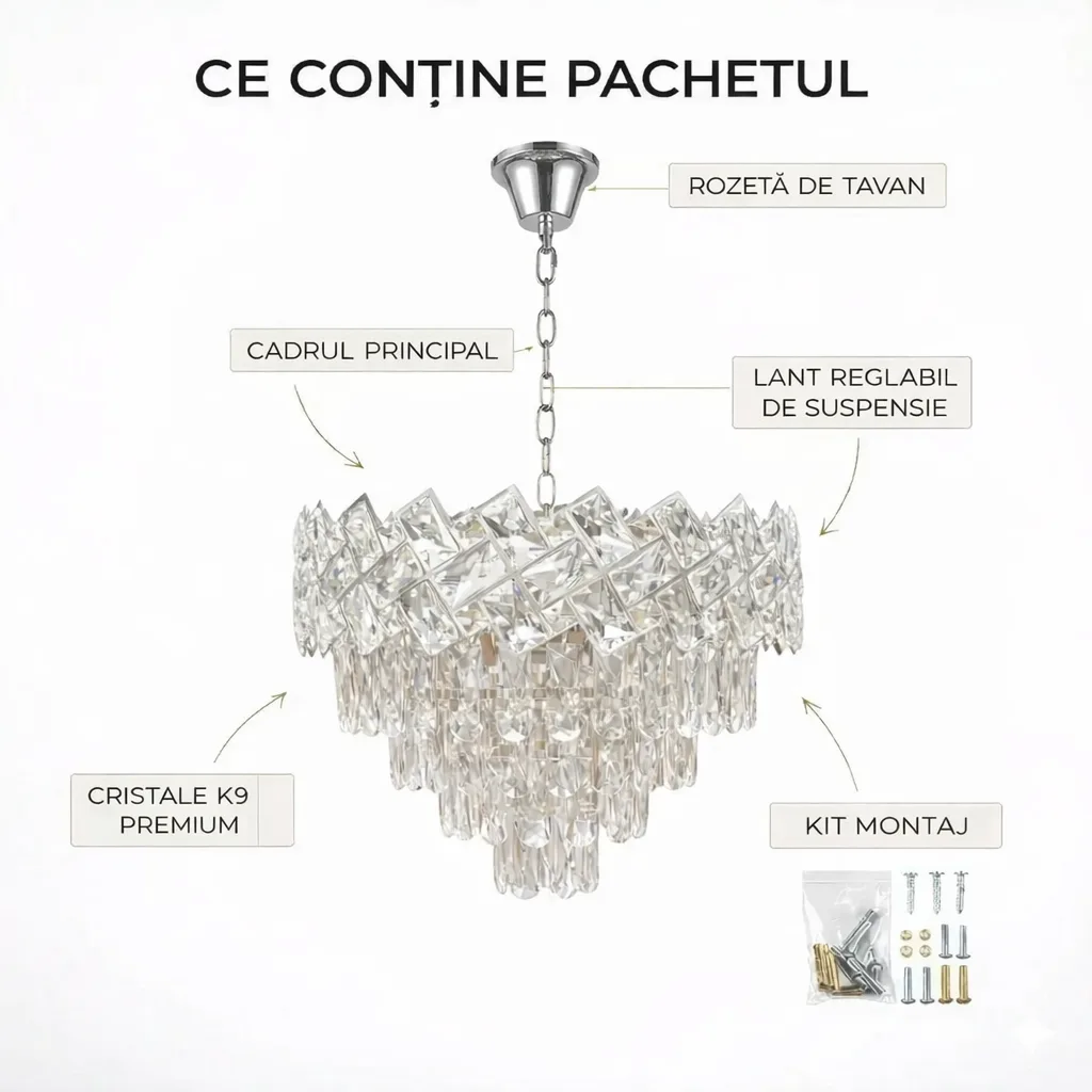 Cristale K9 Premium: Utilizează cristale cu tăieturi geometrice de înaltă calitate pentru a asigura reflexii spectaculoase ale luminii în întreaga încăpere.