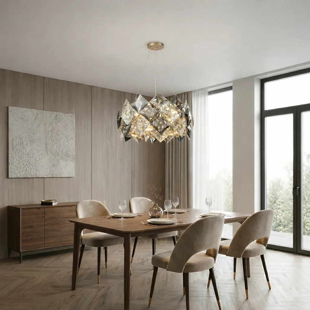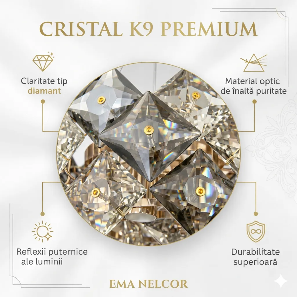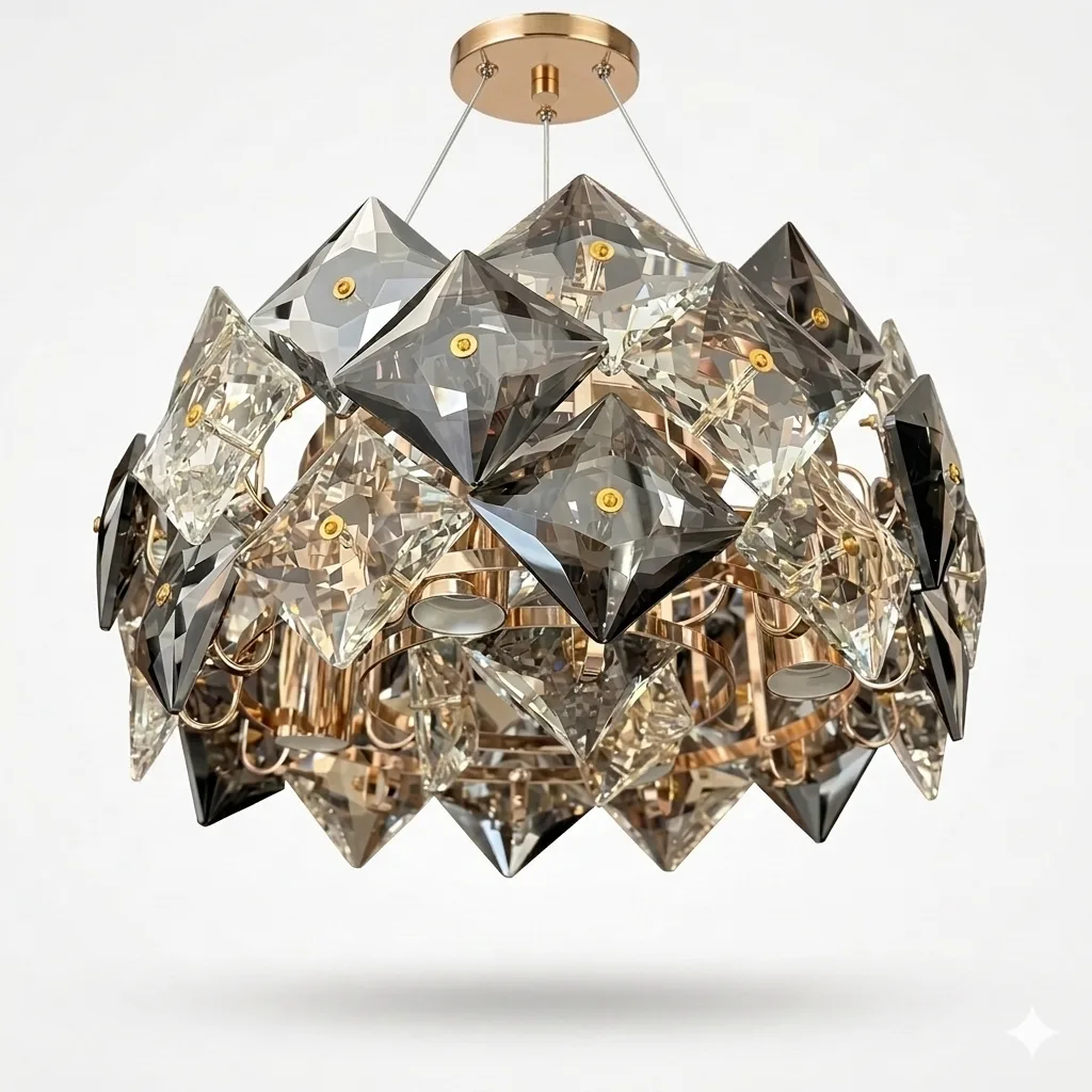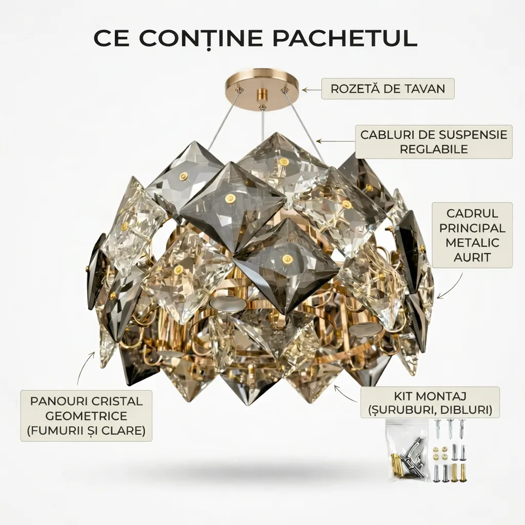 • Design Avangardist: Combinația de cristale romboidale transparente și fumurii creează un contrast dramatic și o estetică modernă, aproape sculpturală.