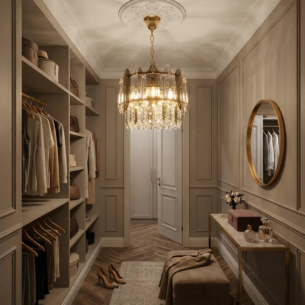 • Zone de dressing: Oferă o strălucire prețioasă și un design de tip boutique de lux într-un spațiu restrâns.
