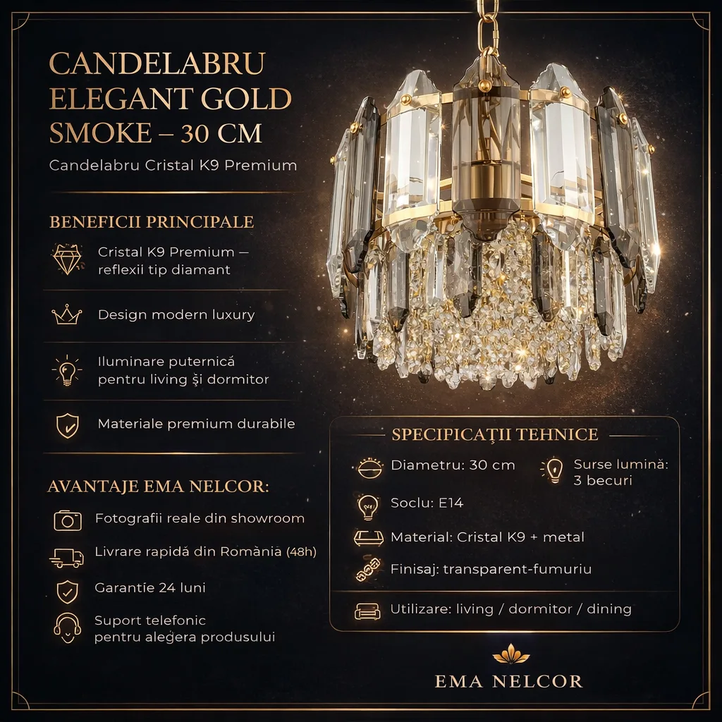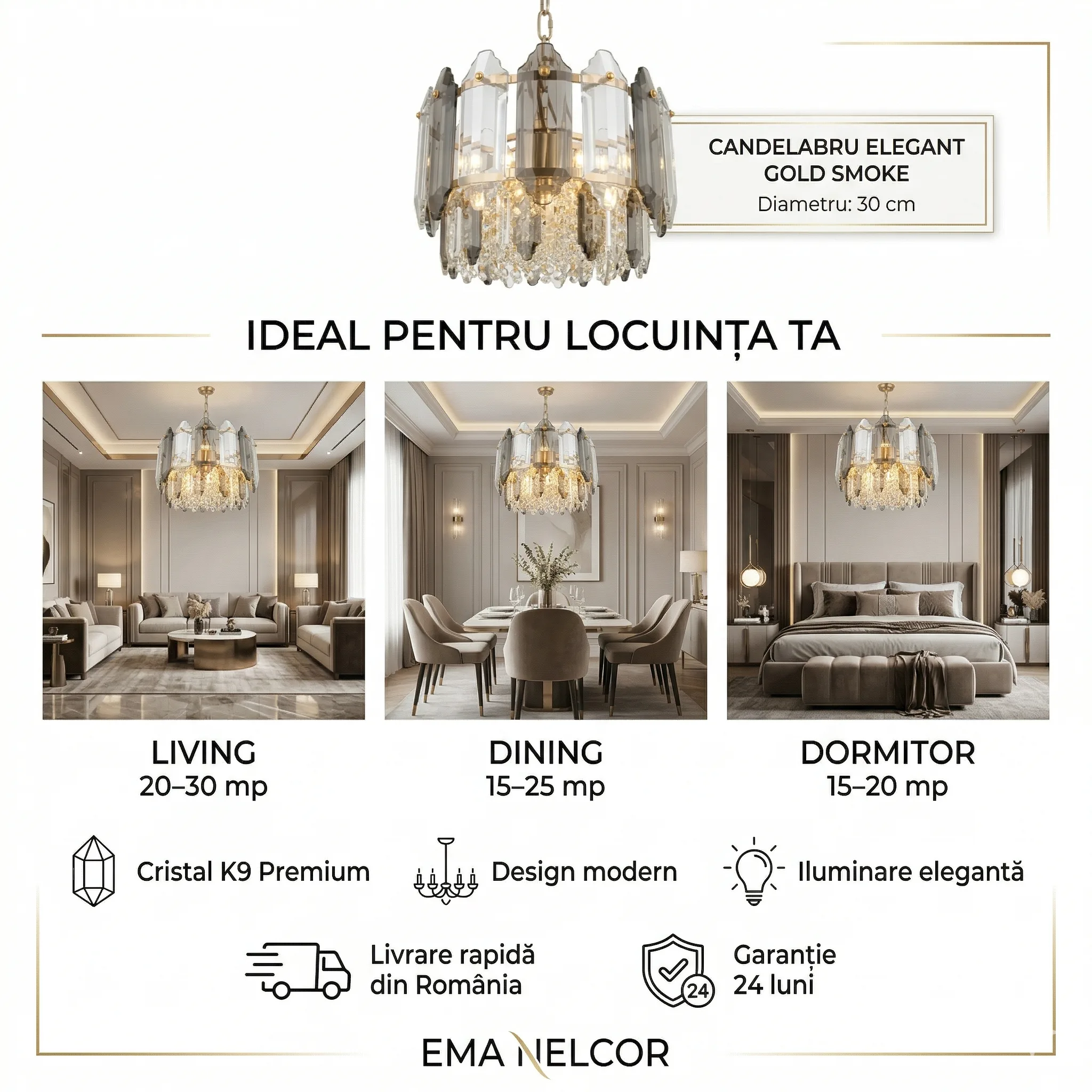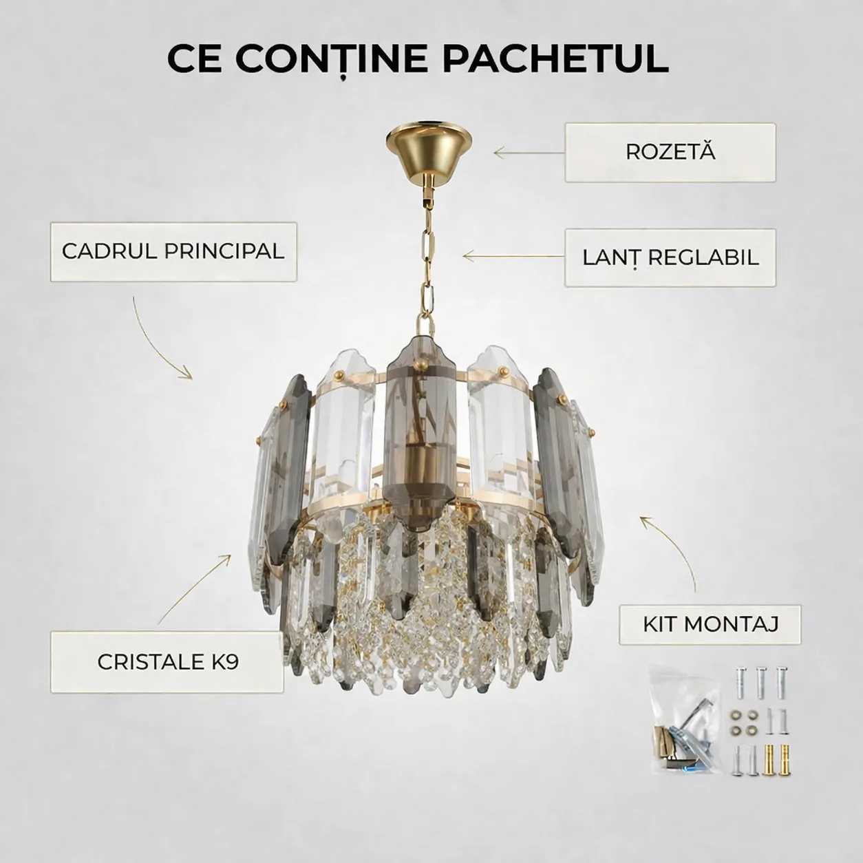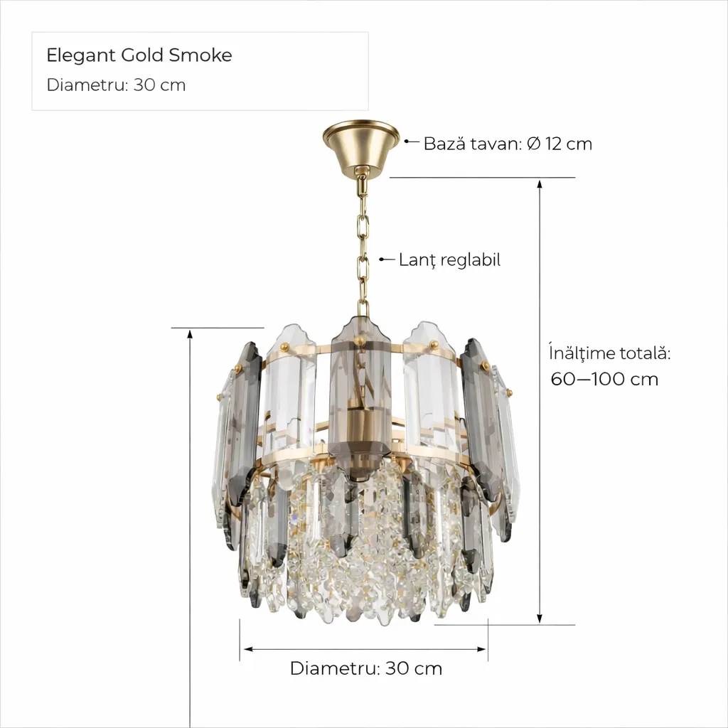 • Finisaj Gold & Smoky: Combinația dintre structura metalică aurie și cristalele fumurii aduce un aer de lux contemporan și misterios oricărui decor.