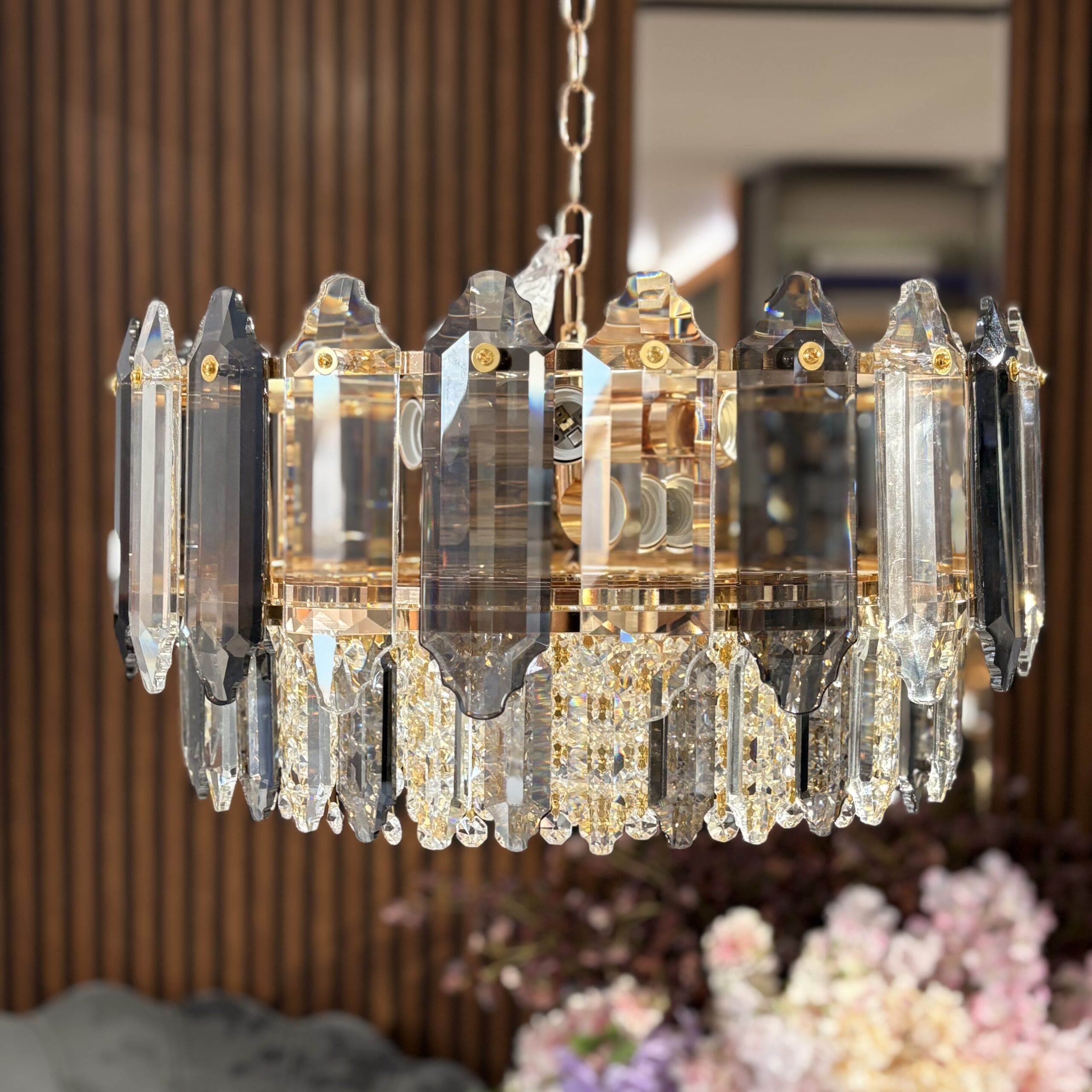Recomandăm becuri LED clare pentru a permite cristalelor să strălucească la potențial maxim. Lumina neutră (4000K) este ideală pentru a evidenția contrastul dintre sticla Smoke și cea transparentă.