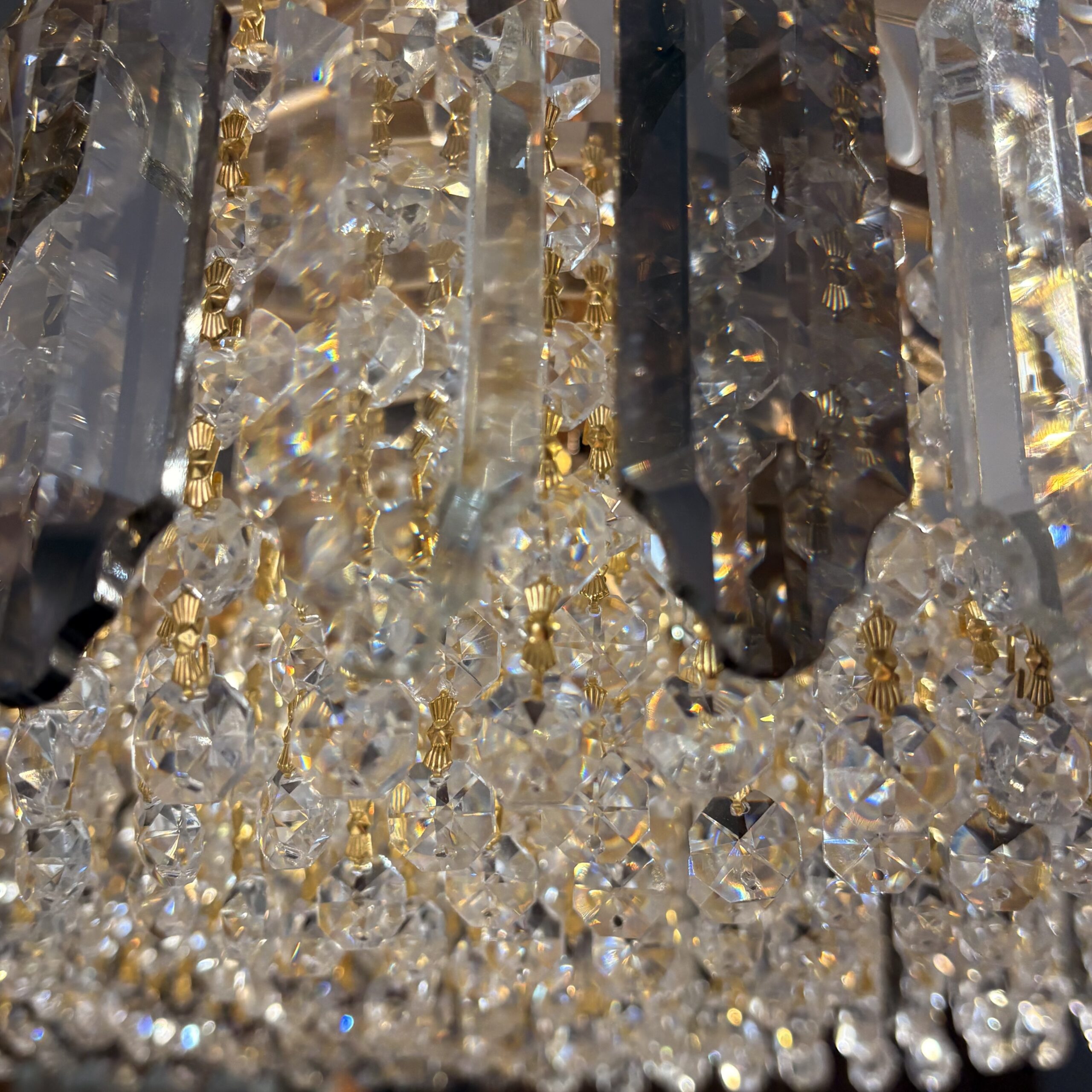 Dotat cu 9 surse de lumină, acest model nu este doar un obiect de decor, ci o adevărată forță iluminatoare. Lumina trece prin cascada bogată de cristale K9 interioare, fiind apoi reflectată diferit de cele două tipuri de sticlă exterioară. Rezultatul este o strălucire densă, caldă și multidimensională, ideală pentru saloane spațioase sau zone de dining impunătoare.