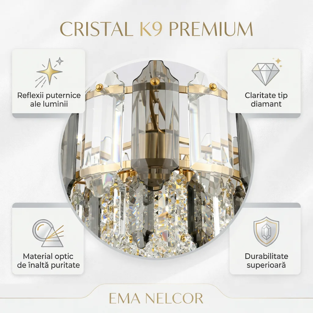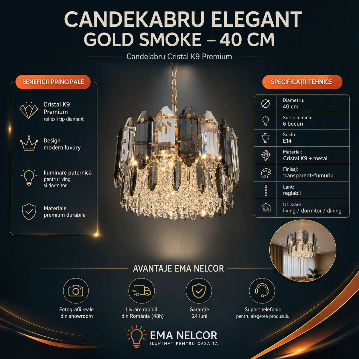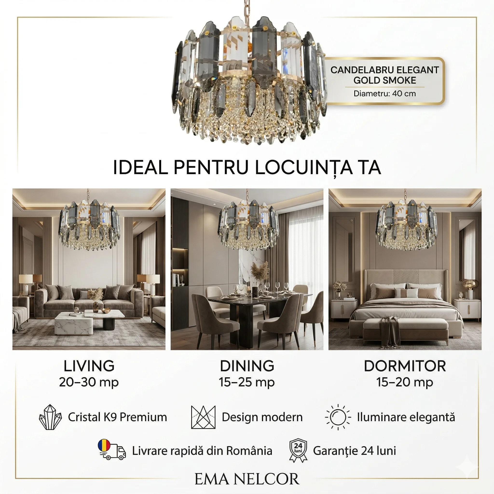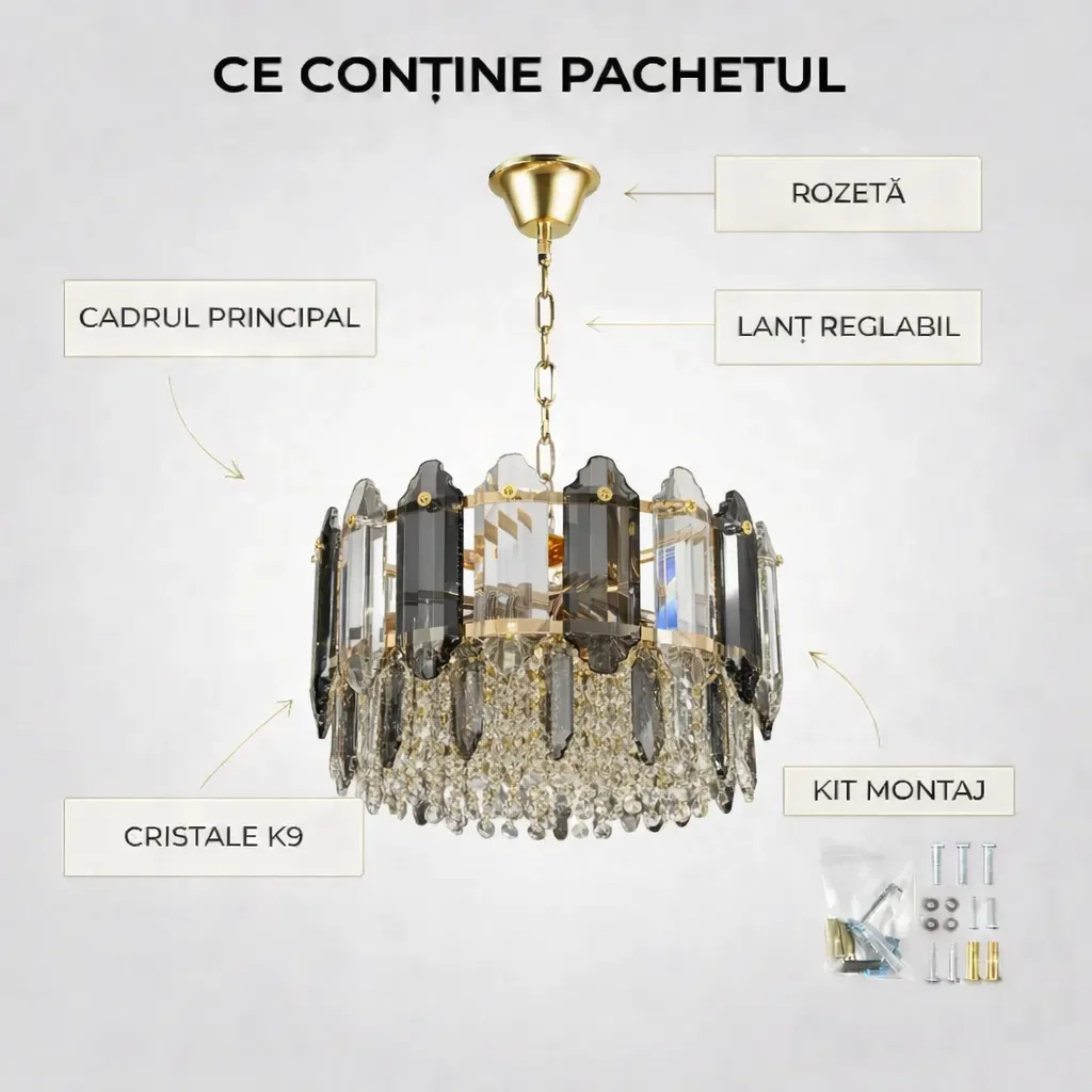 • Finisaj Gold & Smoky: Combinația dintre structura metalică aurie și cristalele fumurii aduce un aer de lux modern și rafinament oricărui decor interior.