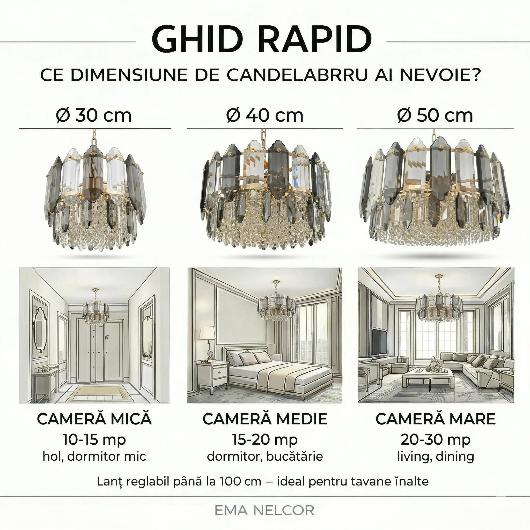 • Design Dual-Tone de Cristal: Dispune de un strat exterior format din cristale lungi, cu tăieturi geometrice în nuanțe fumurii și clare, care protejează un miez bogat de cristale mici, transparente, pentru reflexii complexe.