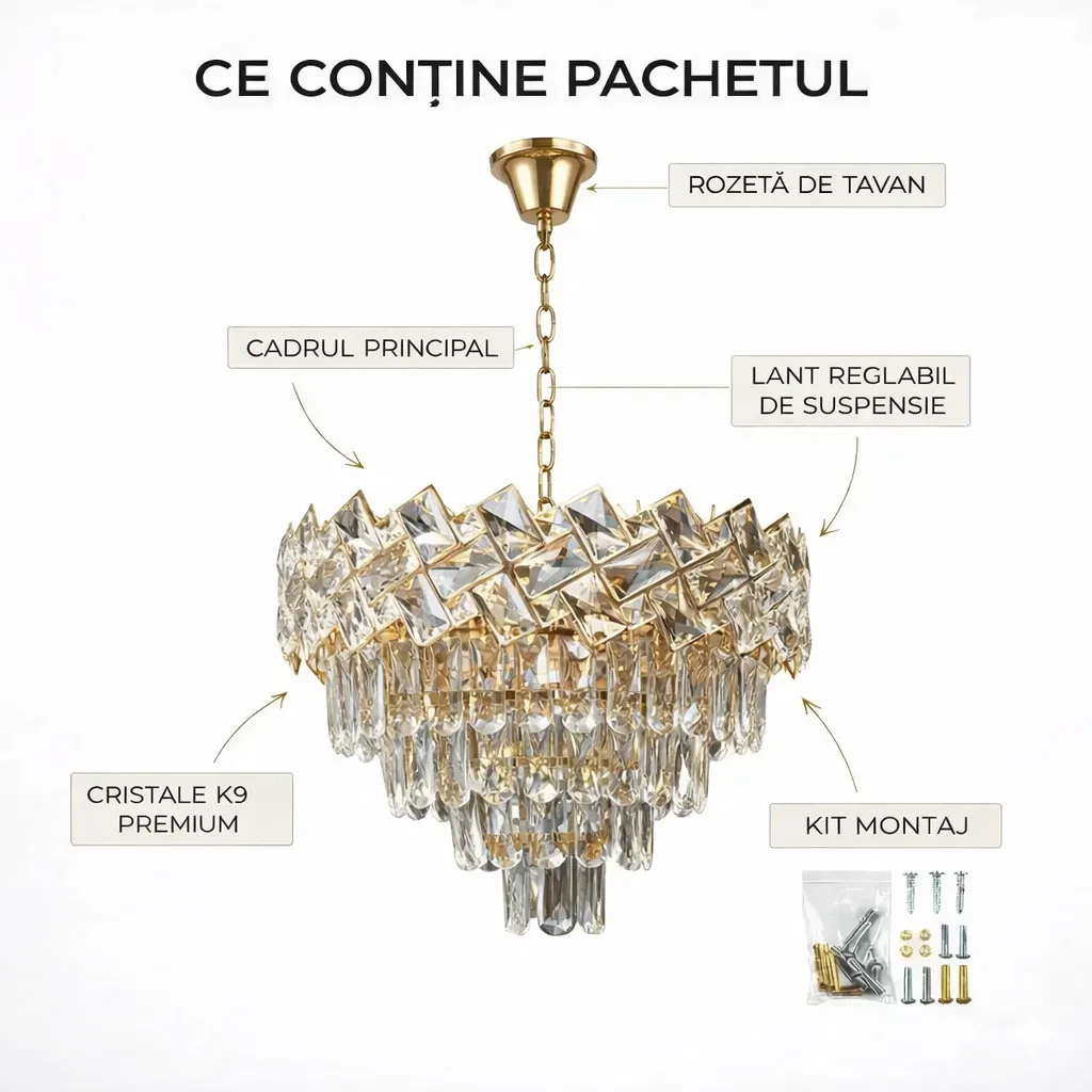 Pentru a ne asigura că produsul ajunge la tine în stare impecabilă, fără zgârieturi sau elemente deteriorate, livrăm această lustră în componente individuale, protejate profesional. Urmează acești pași simpli pentru o asamblare corectă și rapidă a structurii.