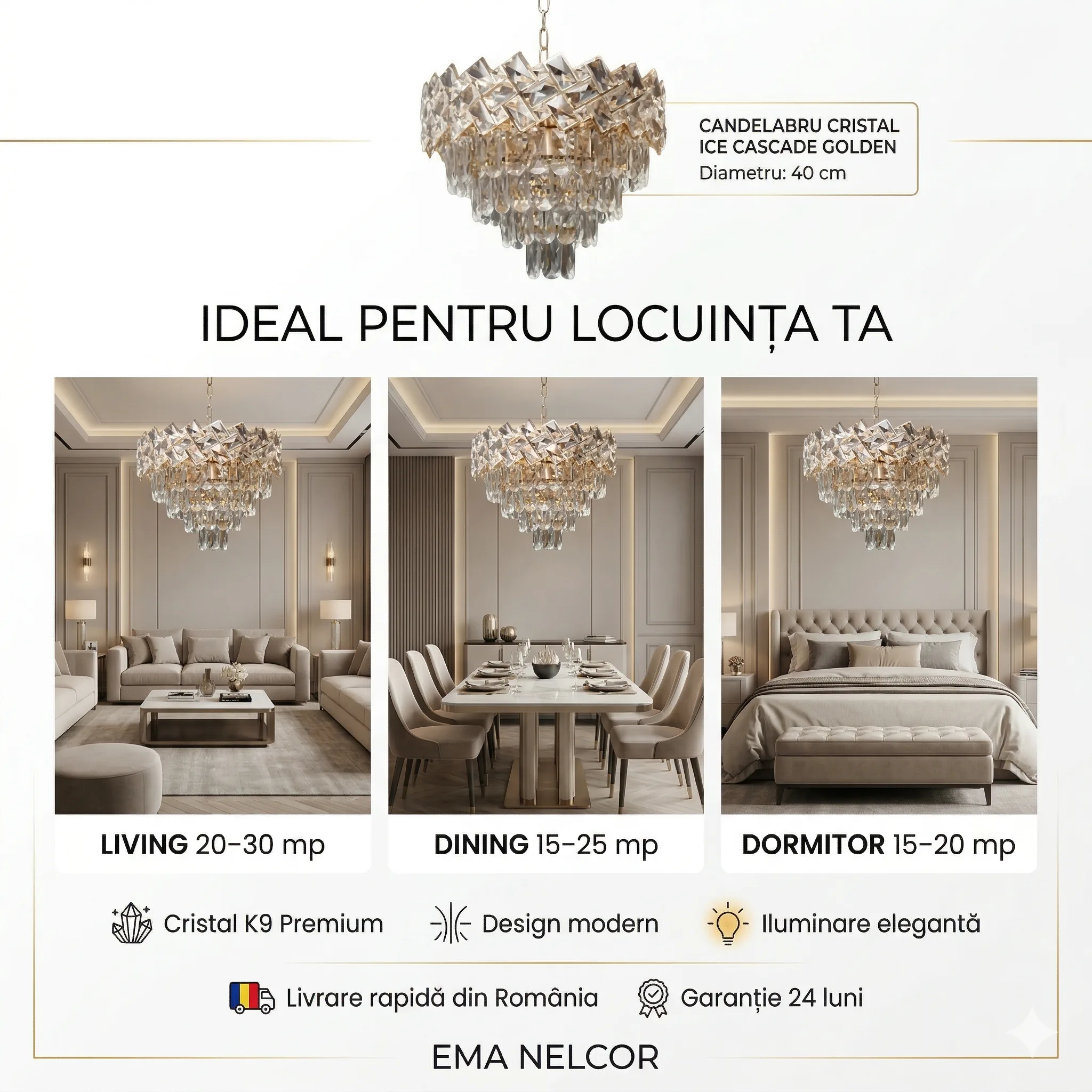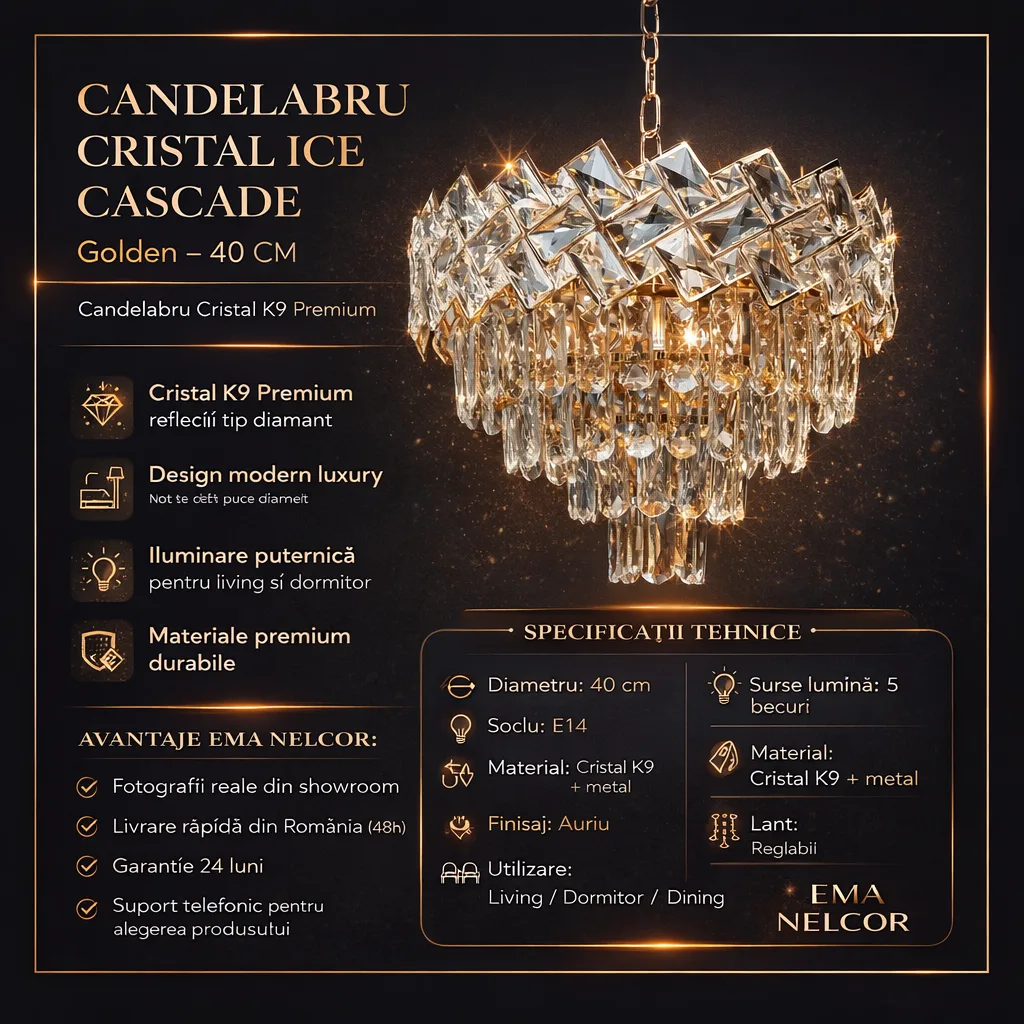 Candelabrul Cristal Ice Cascade Golden de la Ema Nelcor nu este doar o sursă de lumină, ci o declarație de stil. Construit cu Cristal K9 autentic și un finisaj sofisticat French Gold (auriu mat satinat), acesta reflectă lumina în mii de culori, oferind acea atmosferă de lux discret pe care o găsești în hotelurile de 5 stele.