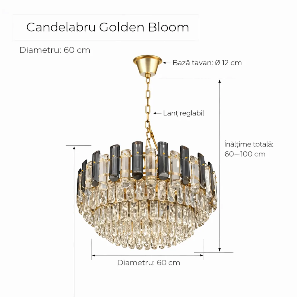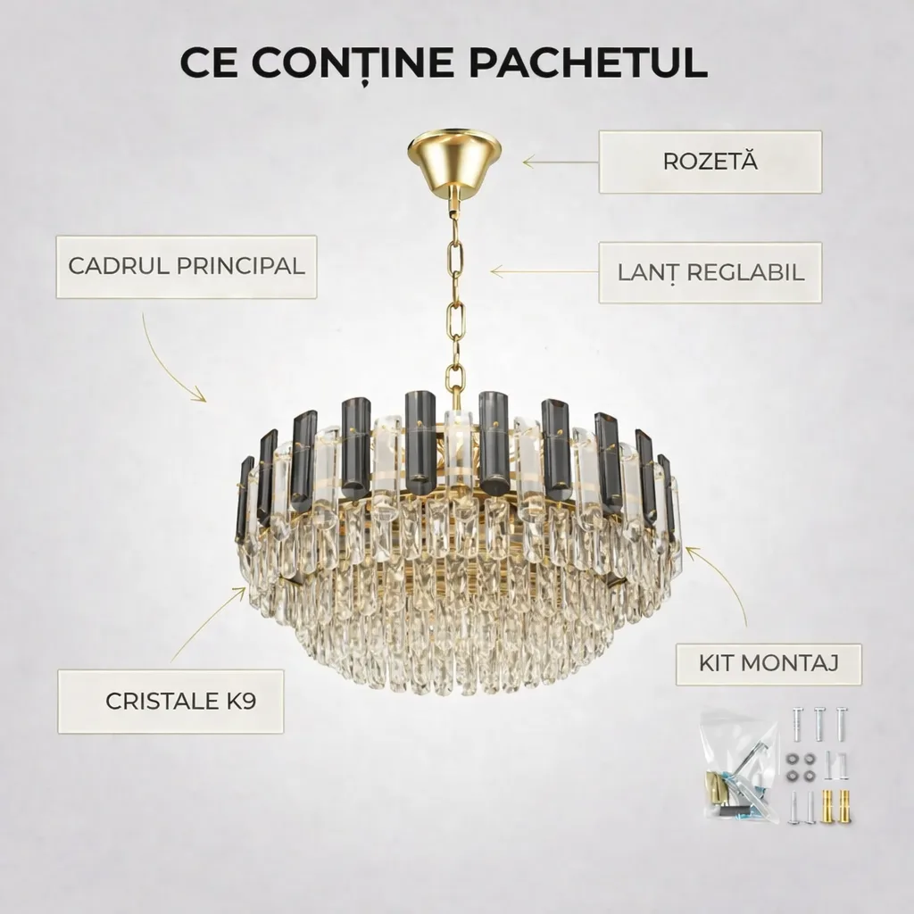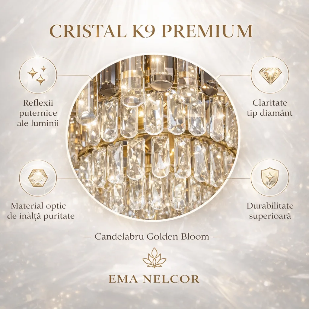 | Materiale de Lux | Cristal K9 & Oțel Auriu | Durabilitate și strălucire care nu se estompează în timp. |