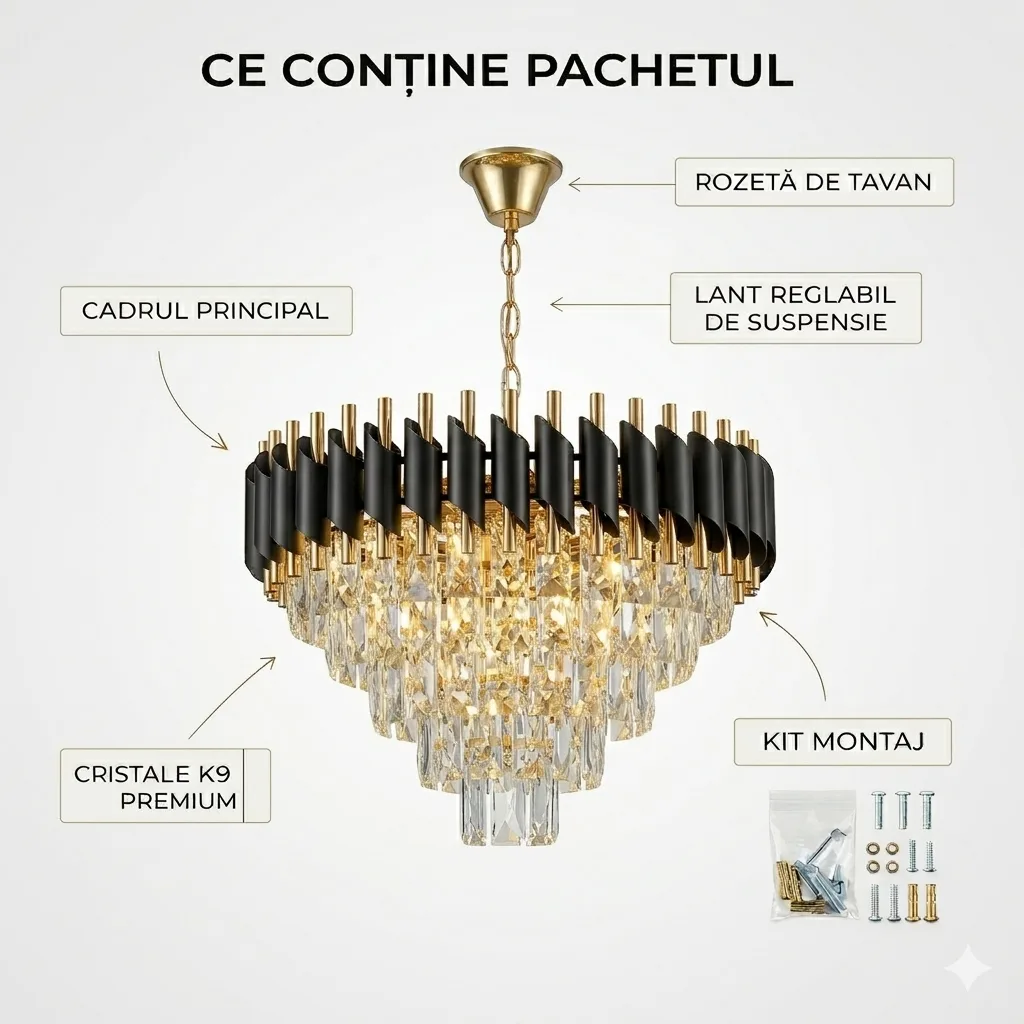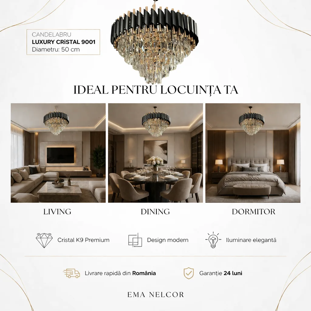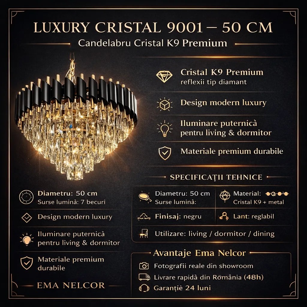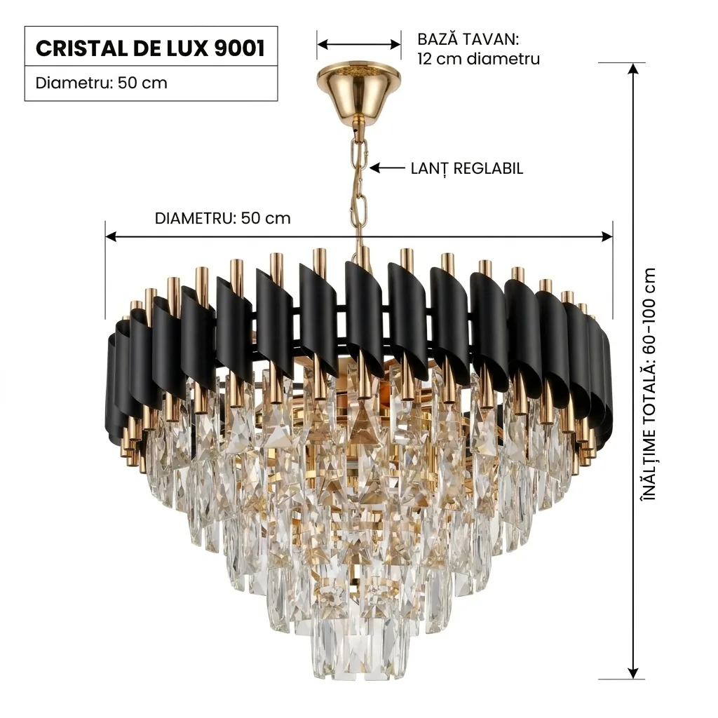 Candelabrul Luxury Cristal Black 50 cm este creat pentru cei care nu se tem de un design îndrăzneț. Această variantă impunătoare folosește contrastul dintre negrul mat exterior și interiorul auriu satinat pentru a crea o ramă dramatică în jurul cascadelor de cristal K9. Cu cele 7 surse de lumină, acest candelabru transformă orice cameră de zi într-un spațiu de gală, oferind o lumină bogată, filtrată spectaculos prin straturile de cristal.