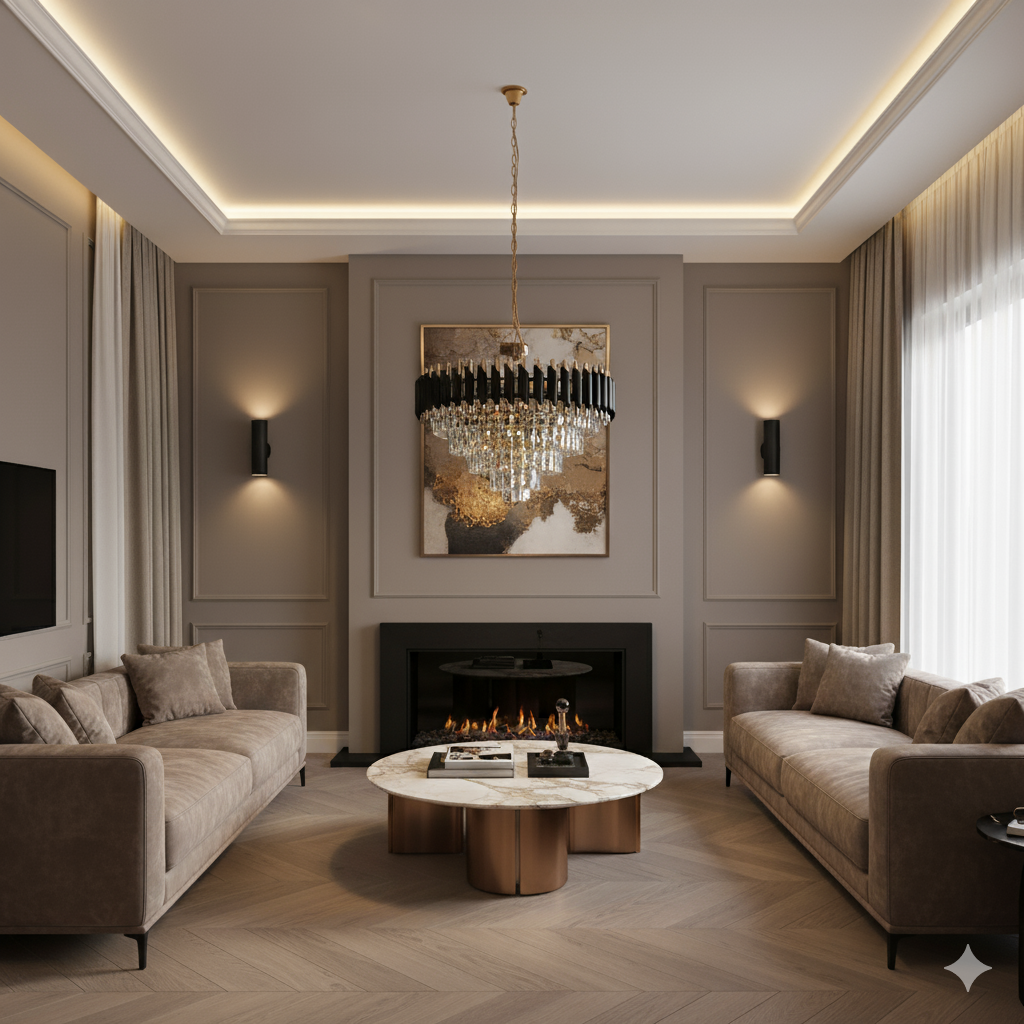 2. Ce tip de lumină recomandăm pentru un living negru cu auriu?