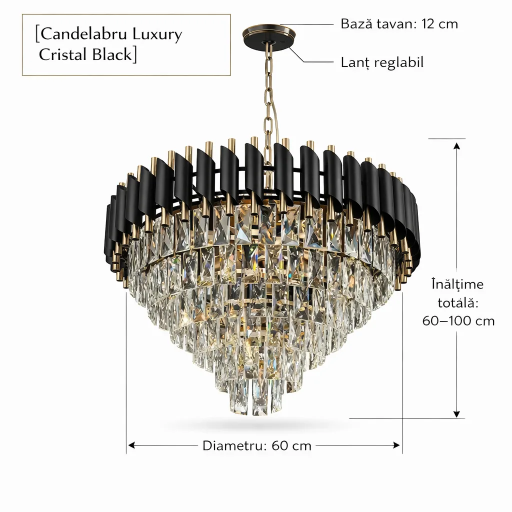 Candelabrul Luxury Cristal Black 60 cm este cea mai mare și mai spectaculoasă variantă a acestui model. Proiectat pentru a domina vizual încăperile spațioase, acest candelabru transformă contrastul dintre negrul mat și interiorul auriu într-o adevărată formă de artă. Cele 8 surse de lumină lucrează împreună cu sutele de cristale K9 pentru a crea o explozie de sclipiri pe care finisajul negru le încadrează perfect, oferindu-le o strălucire și mai intensă.