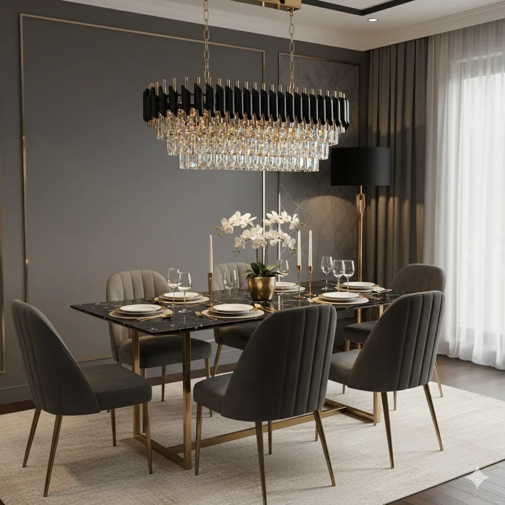 1. Cum influențează finisajul negru lumina din cameră? Structura neagră mată este opacă, ceea ce înseamnă că direcționează lumina exclusiv prin cascada de cristale. Acest lucru elimină reflexiile deranjante pe tavan și concentrează toată strălucirea spre masa de dining, creând un efect dramatic, de tip "spotlight".