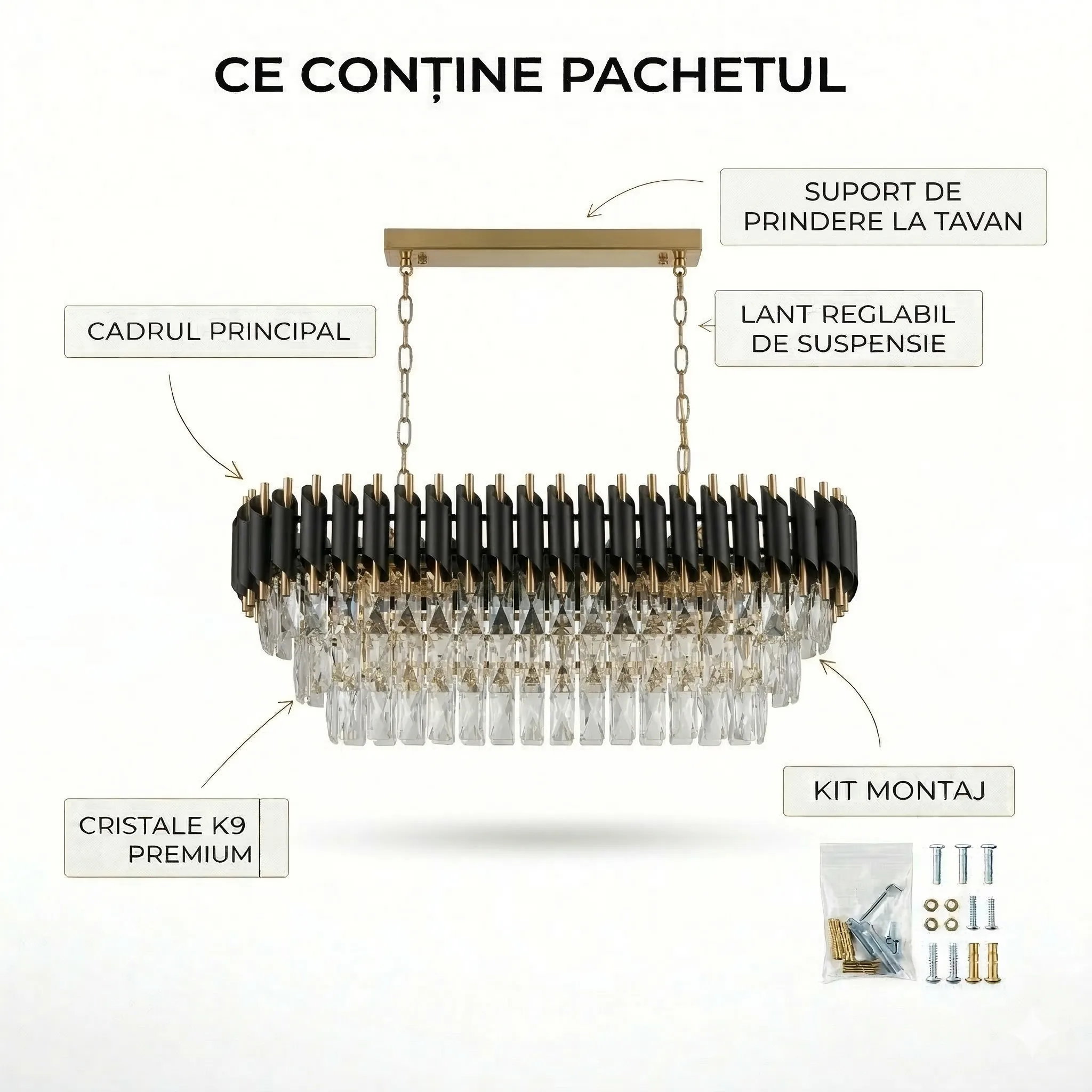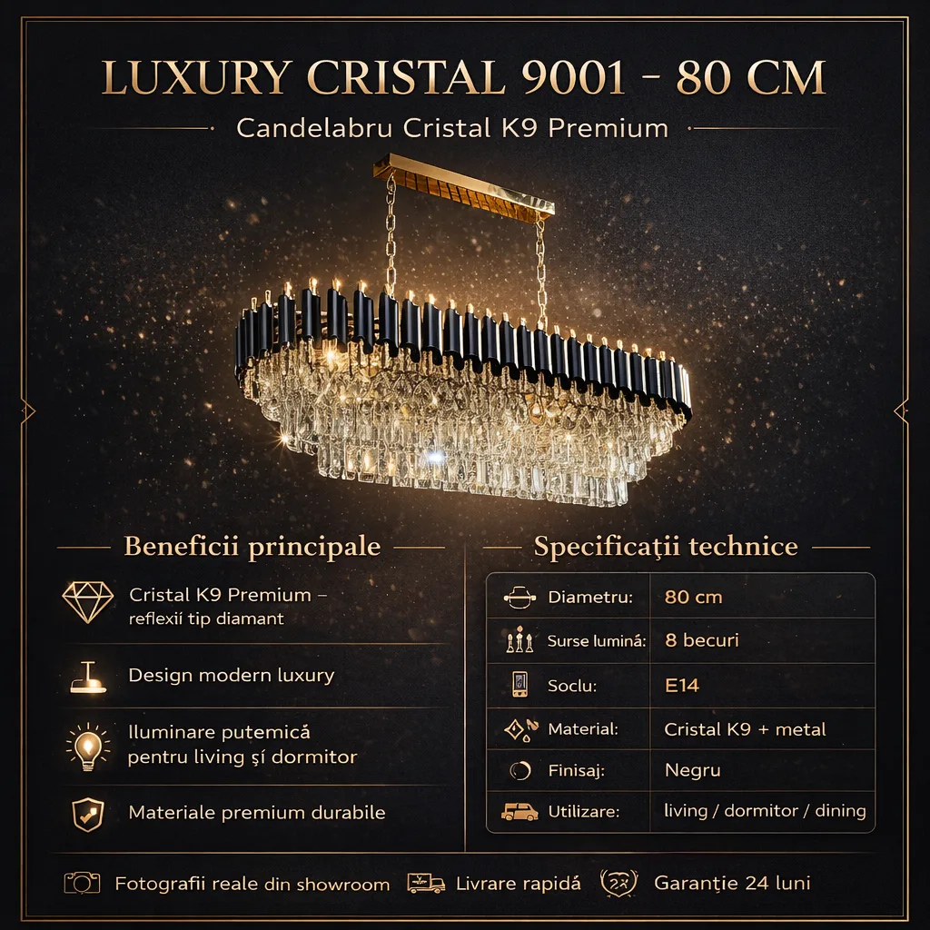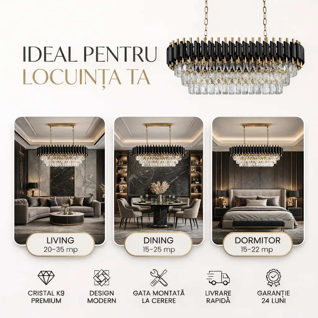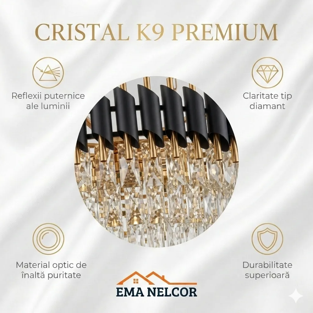 | Materiale de Lux | Cristal K9 & Oțel Negru Mat | Mix premium de materiale durabile cu estetică de top. |
