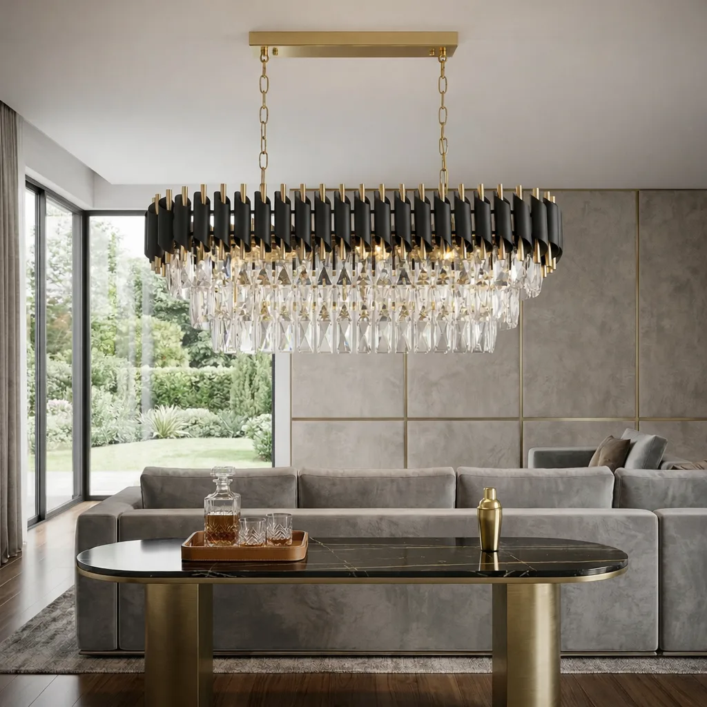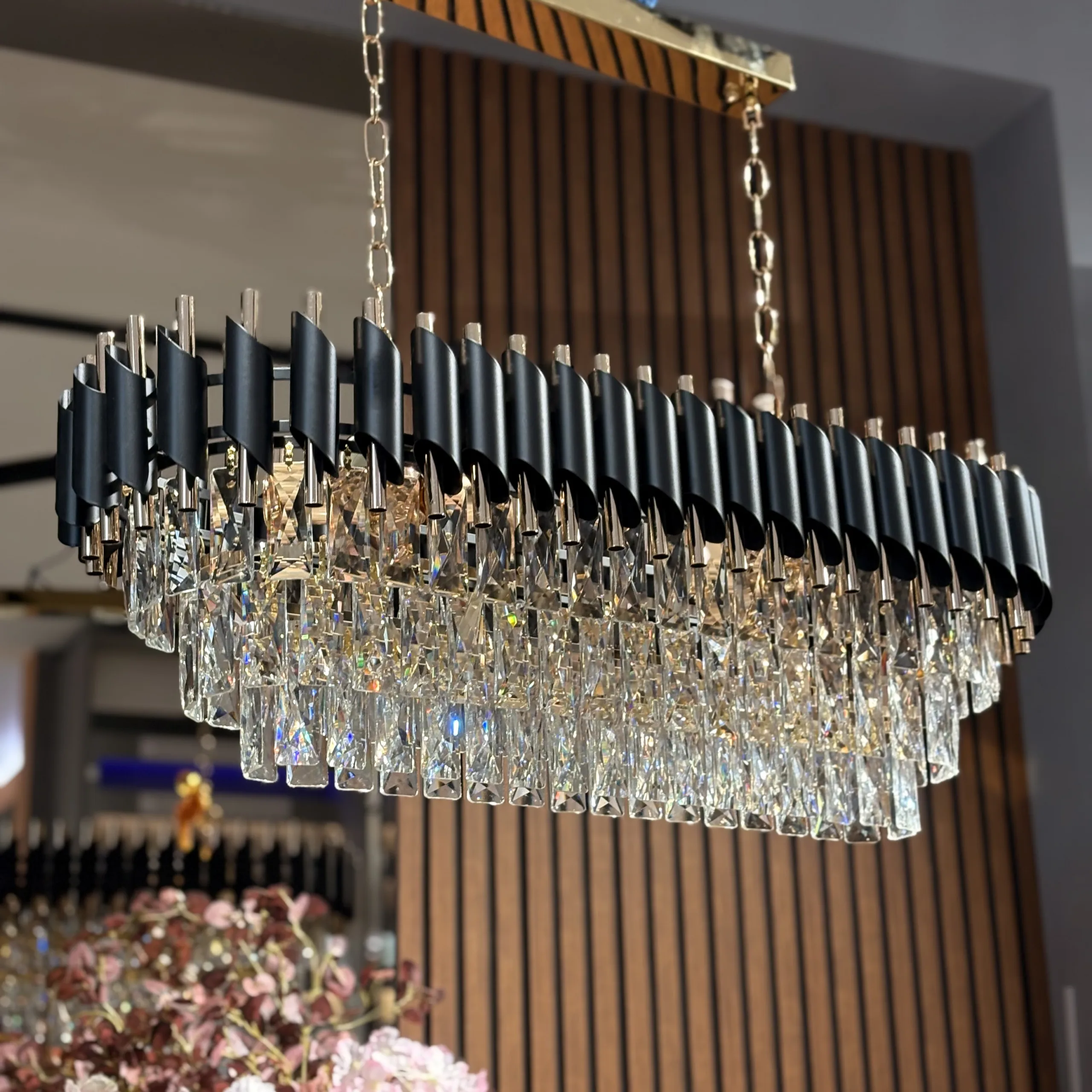 Dotat cu 8 surse de lumină distribuite pe o lungime de 80 cm, acest model liniar oferă o iluminare intensă și uniformă, fiind proiectat special pentru a domina vizual mesele lungi de dining sau insulele de bucătărie. Negrul structurii nu doar că adaugă profunzime designului, dar face ca sclipirile cristalelor să pară mai vibrante și mai clare, oferind un spectacol de lumină ce atrage toate privirile.