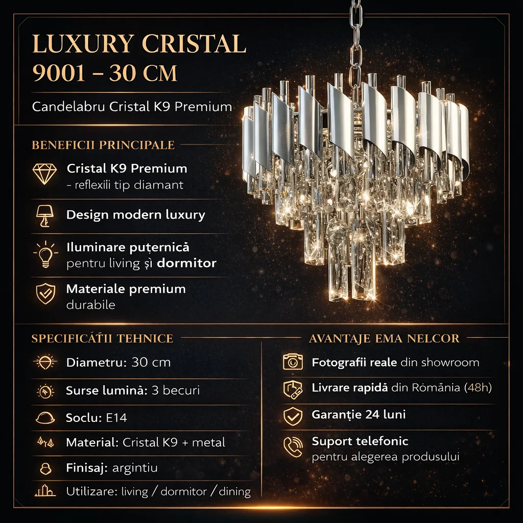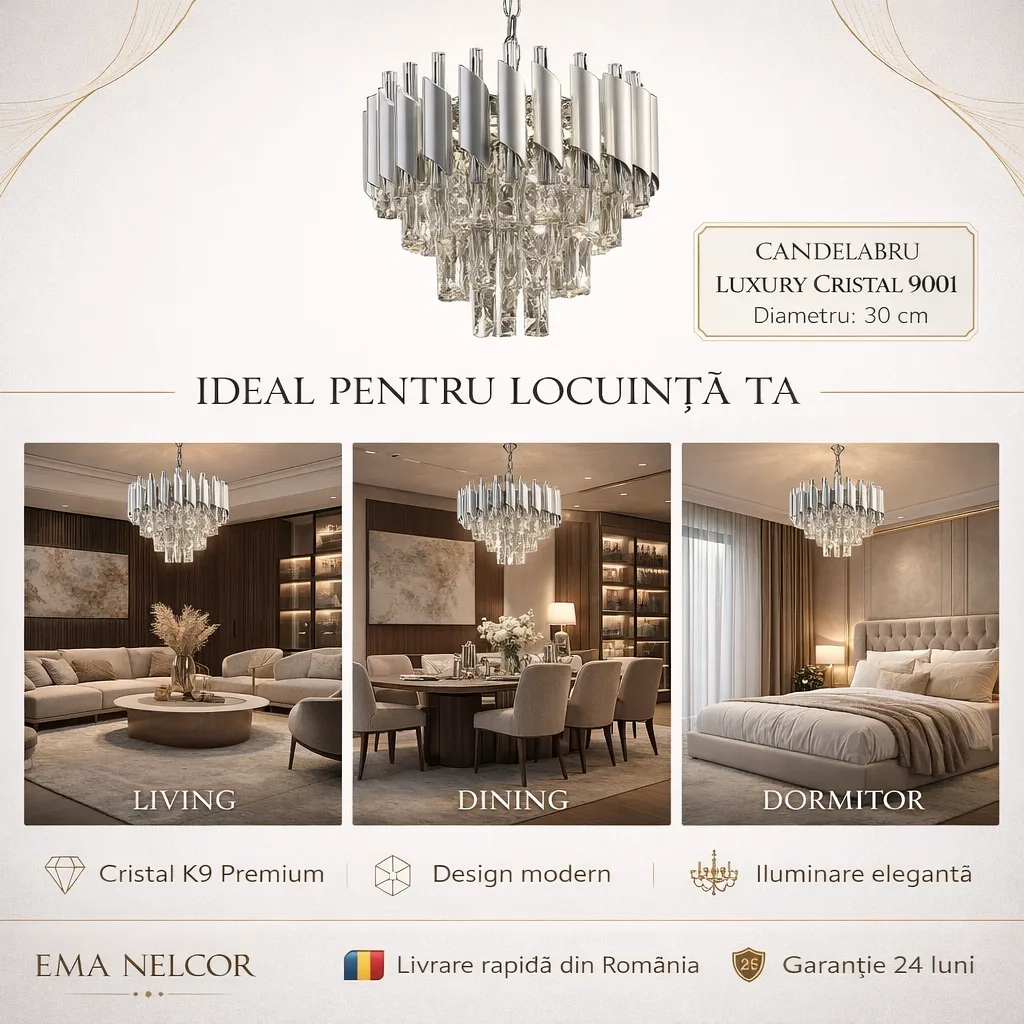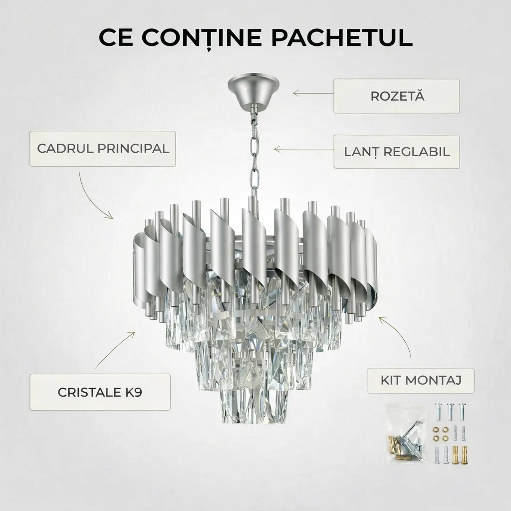 | Materiale de Lux | Cristal K9 & Oțel Argintiu Satinat | Rezistență la oxidare și un aspect premium care durează în timp. |
