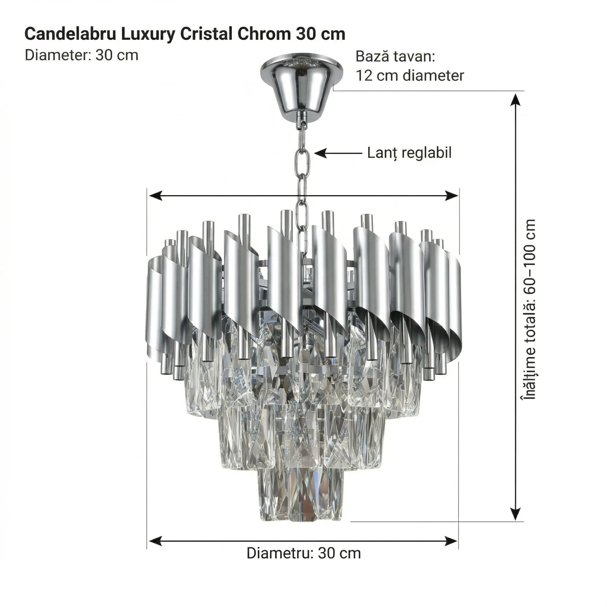 Candelabru Luxury Cristal Chrome 30 cm – Cristal K9 Premium și Metal Argintiu Cromat, 3 Surse E14, Design Modern pentru Hol, D