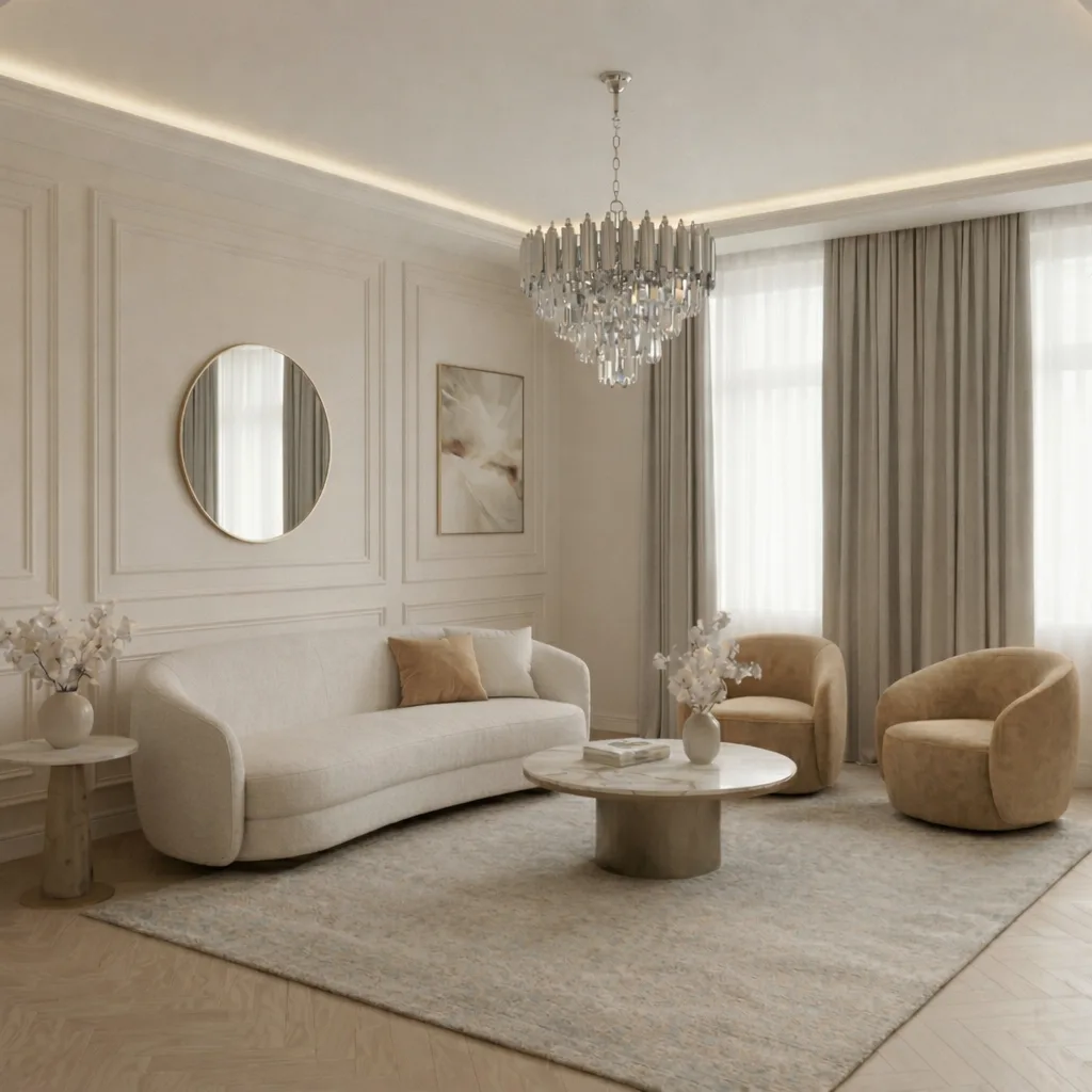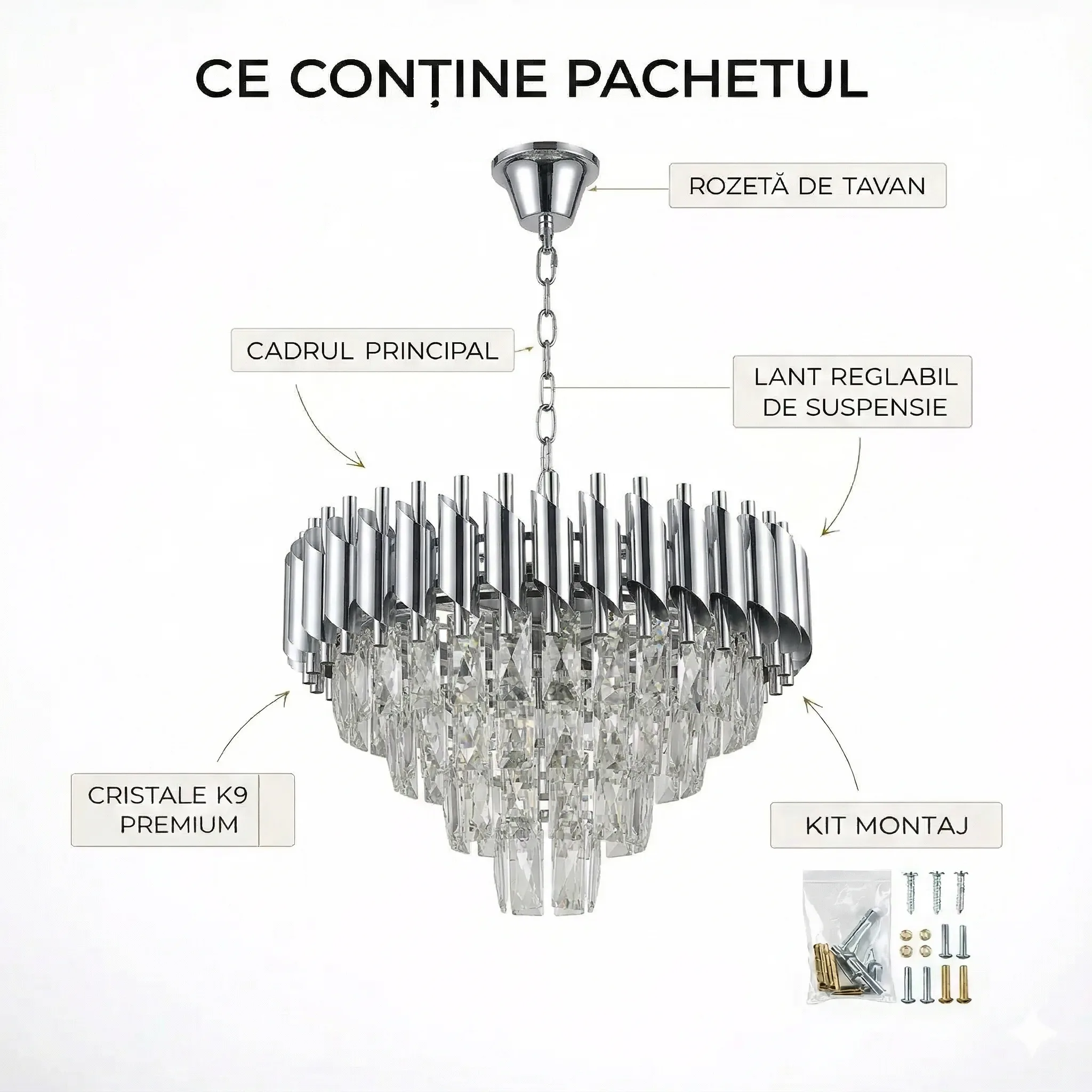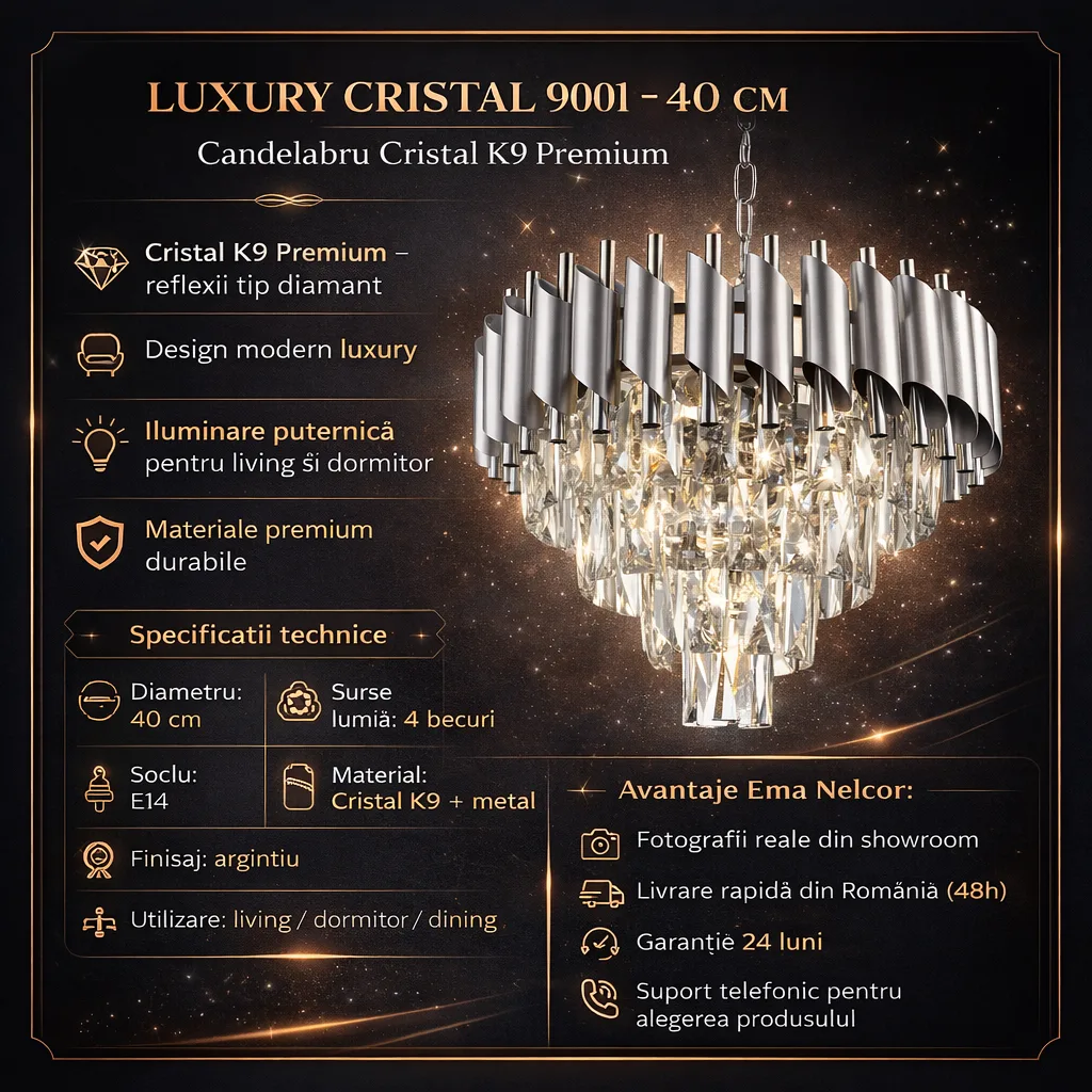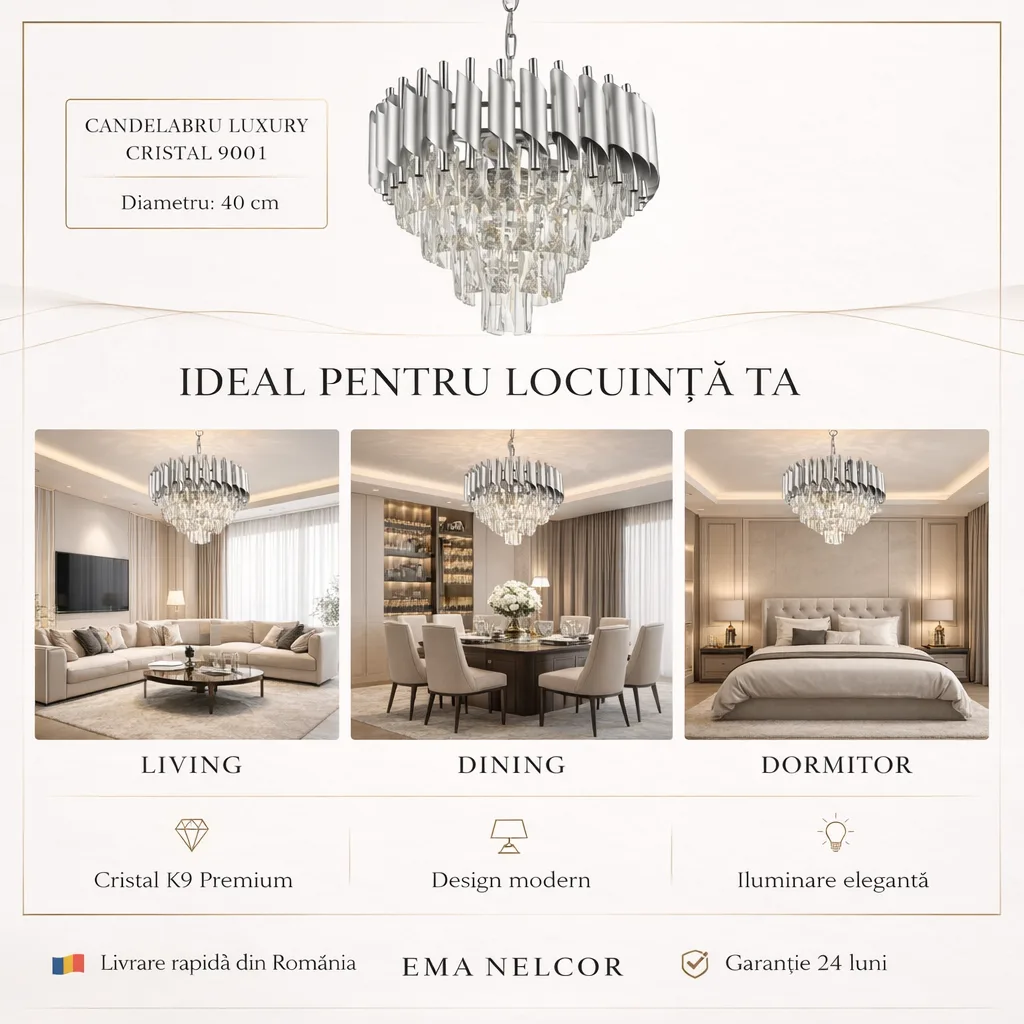 | Materiale de Lux | Cristal K9 & Oțel Argintiu Satinat | Materiale premium care garantează reflexii impecabile și durabilitate. |