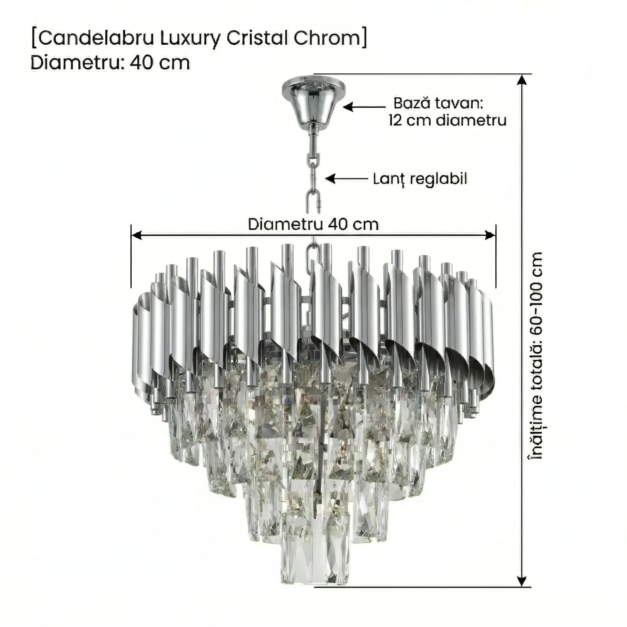 Candelabrul Luxury Cristal Chrome 40 cm este varianta „standard” ideală pentru camerele de dimensiuni medii. Finisajul argintiu satinat (mat) oferă o notă de rafinament contemporan, fiind mult mai discret și mai distins decât variantele lucioase. Cele 4 surse de lumină sunt poziționate strategic pentru a pune în valoare cascadele de cristale K9, oferind acea strălucire de diamant care transformă imediat atmosfera camerei.