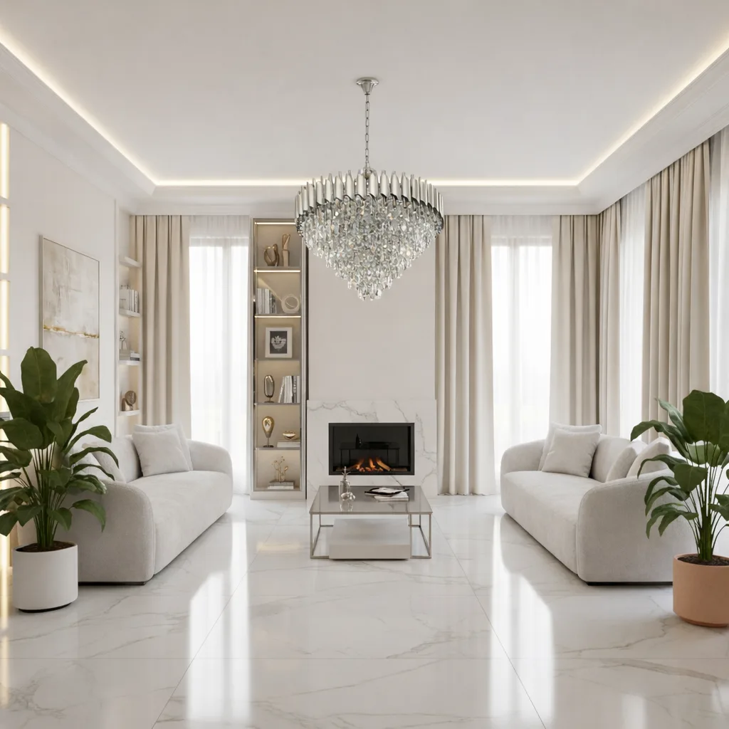 Lamelele exterioare argintii încadrează perfect cascada densă de cristale K9, multiplicând reflexiile și oferind o iluminare omogenă. Este piesa ideală pentru interioarele de lux care mizează pe tonuri neutre, unde se dorește un impact vizual puternic fără a încărca decorul cu culori stridente.