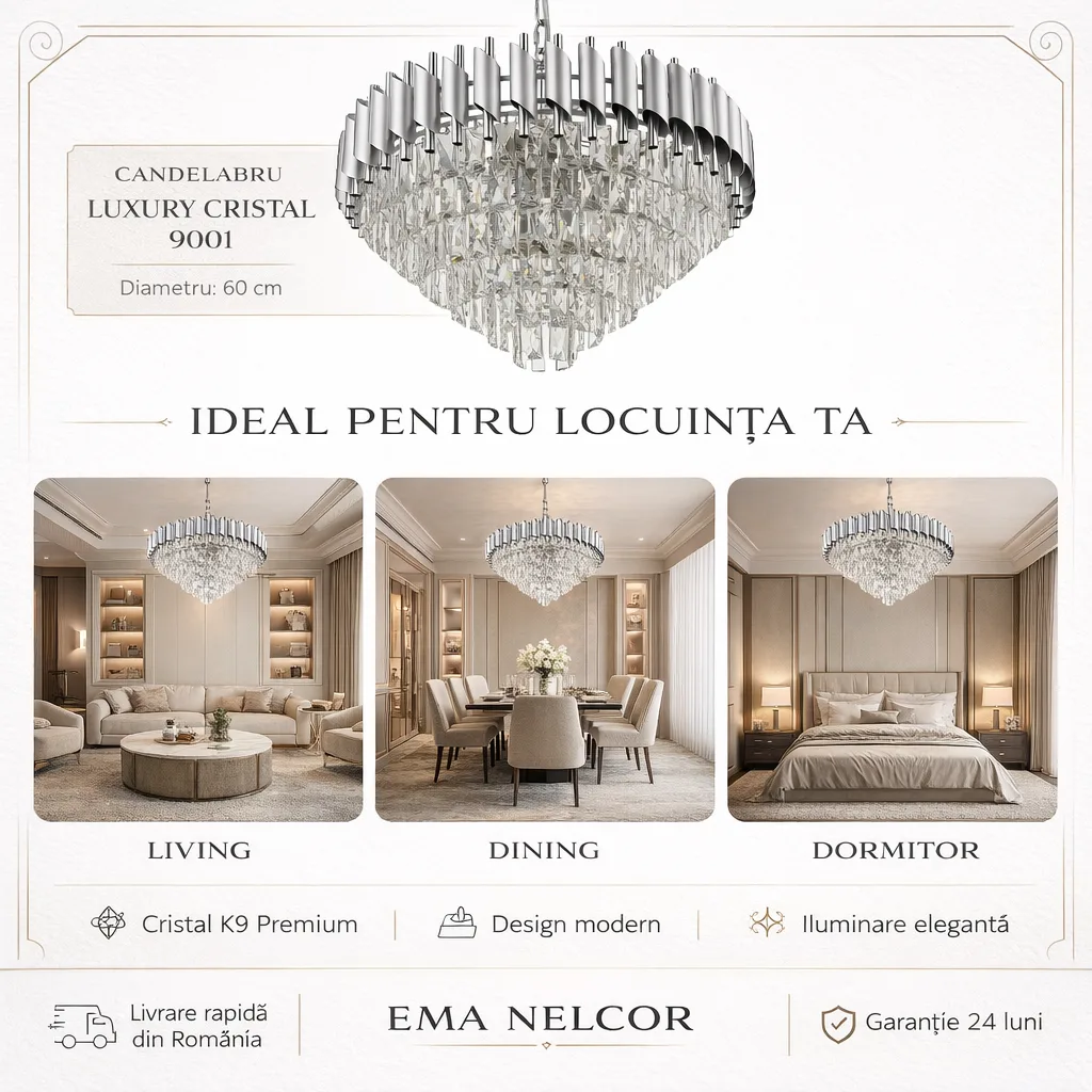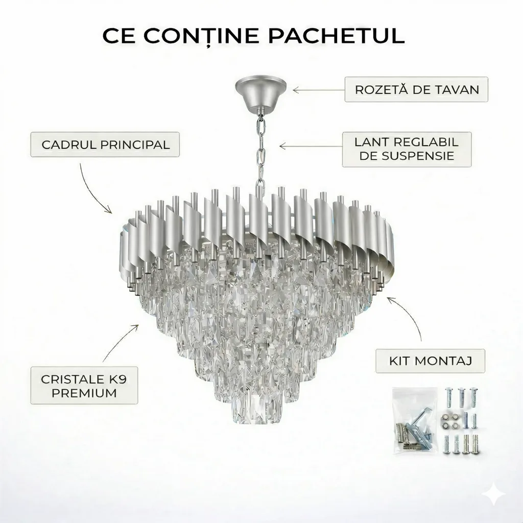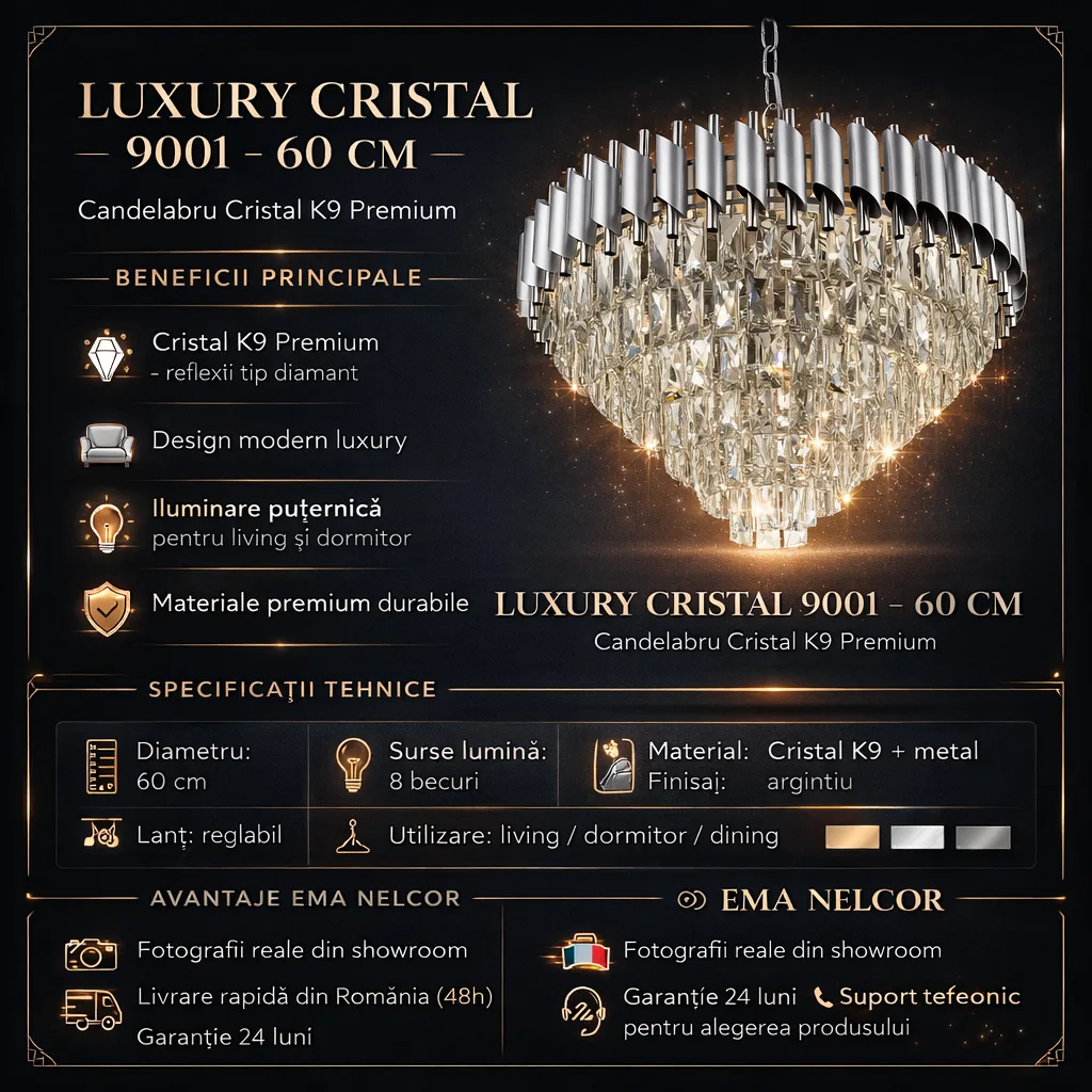 | Materiale de Lux | Cristal K9 & Oțel Argintiu Satinat | Calitate premium ce garantează reflexii clare și durabilitate. |