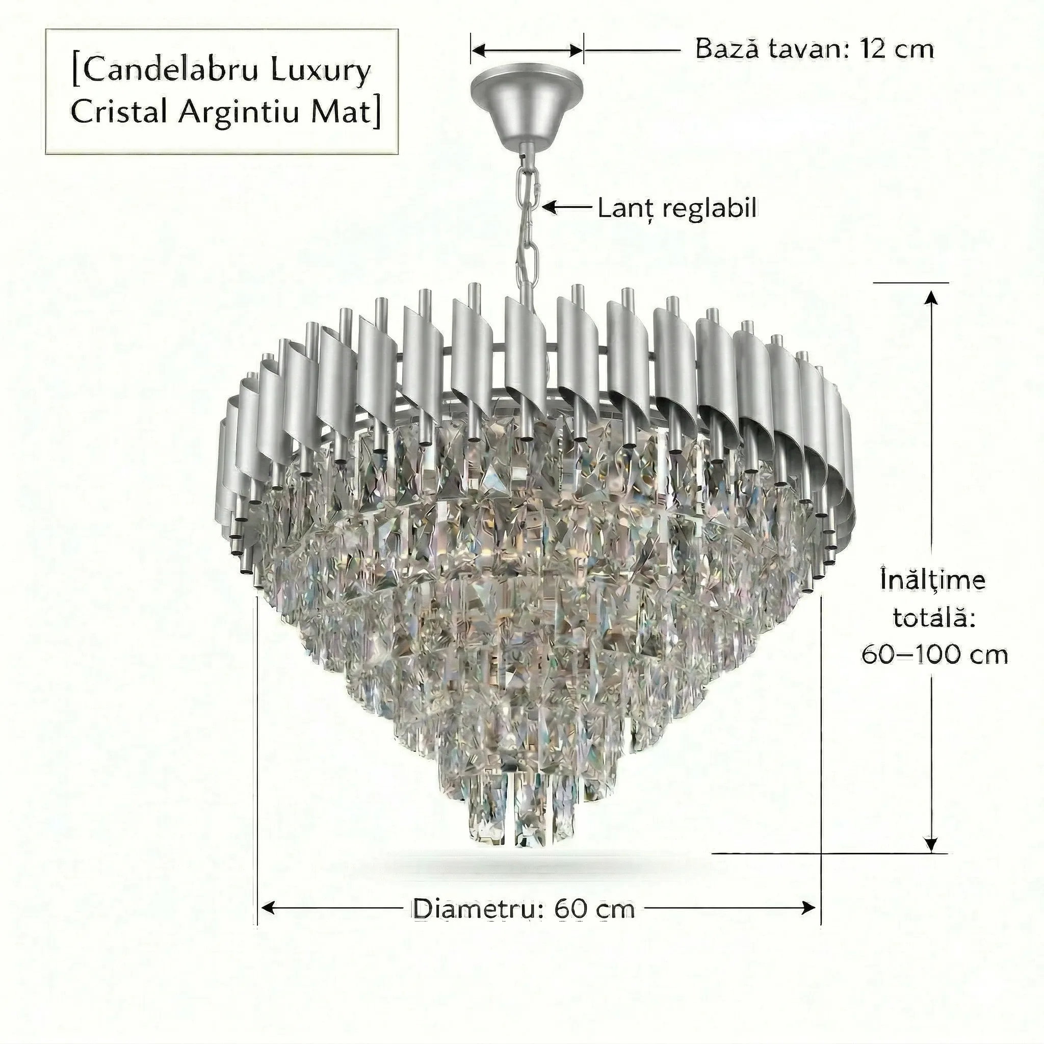 Candelabrul Luxury Cristal Chrome 60 cm este varianta maximă a eleganței contemporane. Finisajul argintiu satinat (mat) îi oferă un aspect de „bijuterie tehnologică”, fiind extrem de rafinat și sobru în același timp. Cu un diametru generos și nu mai puțin de 8 surse de lumină, acest model transformă orice living mare sau zonă de recepție într-un spațiu plin de strălucire și claritate.