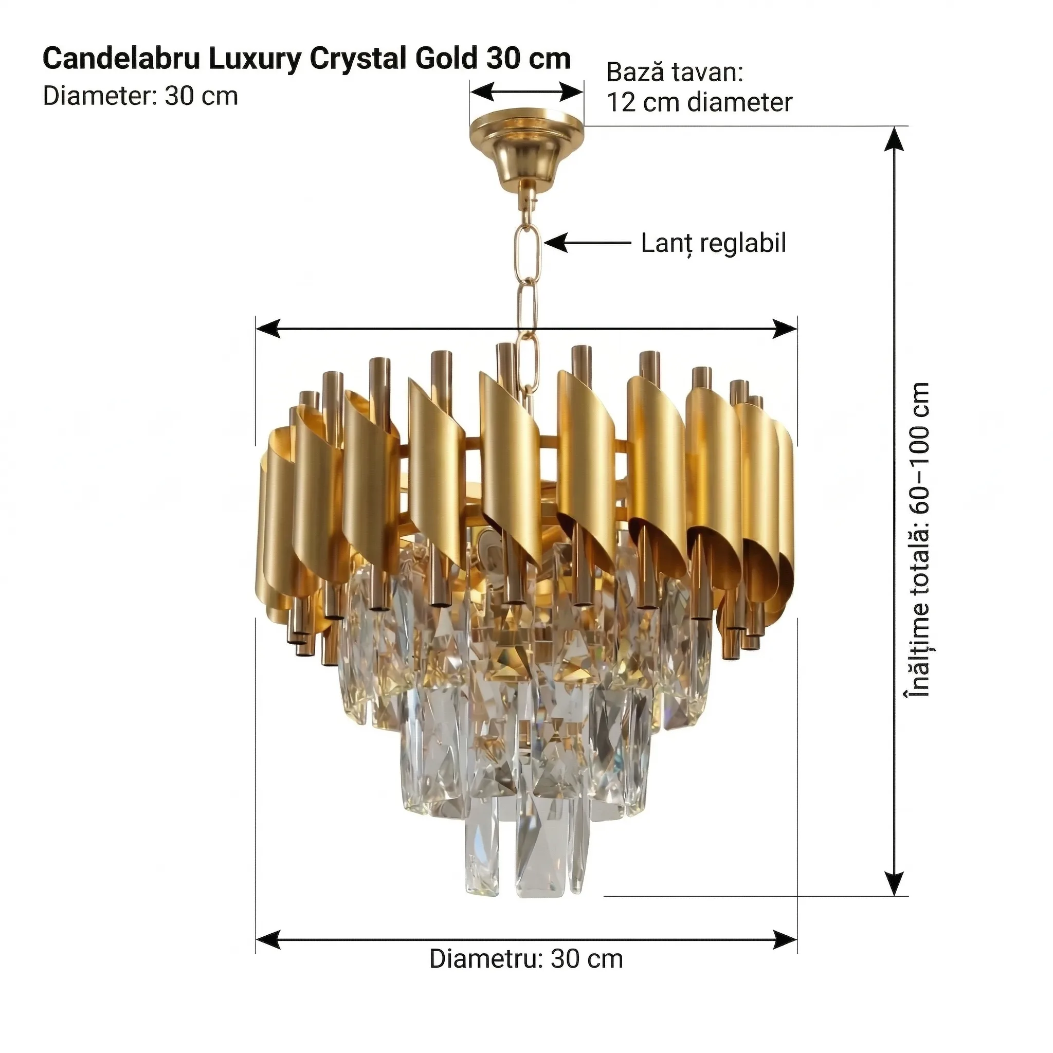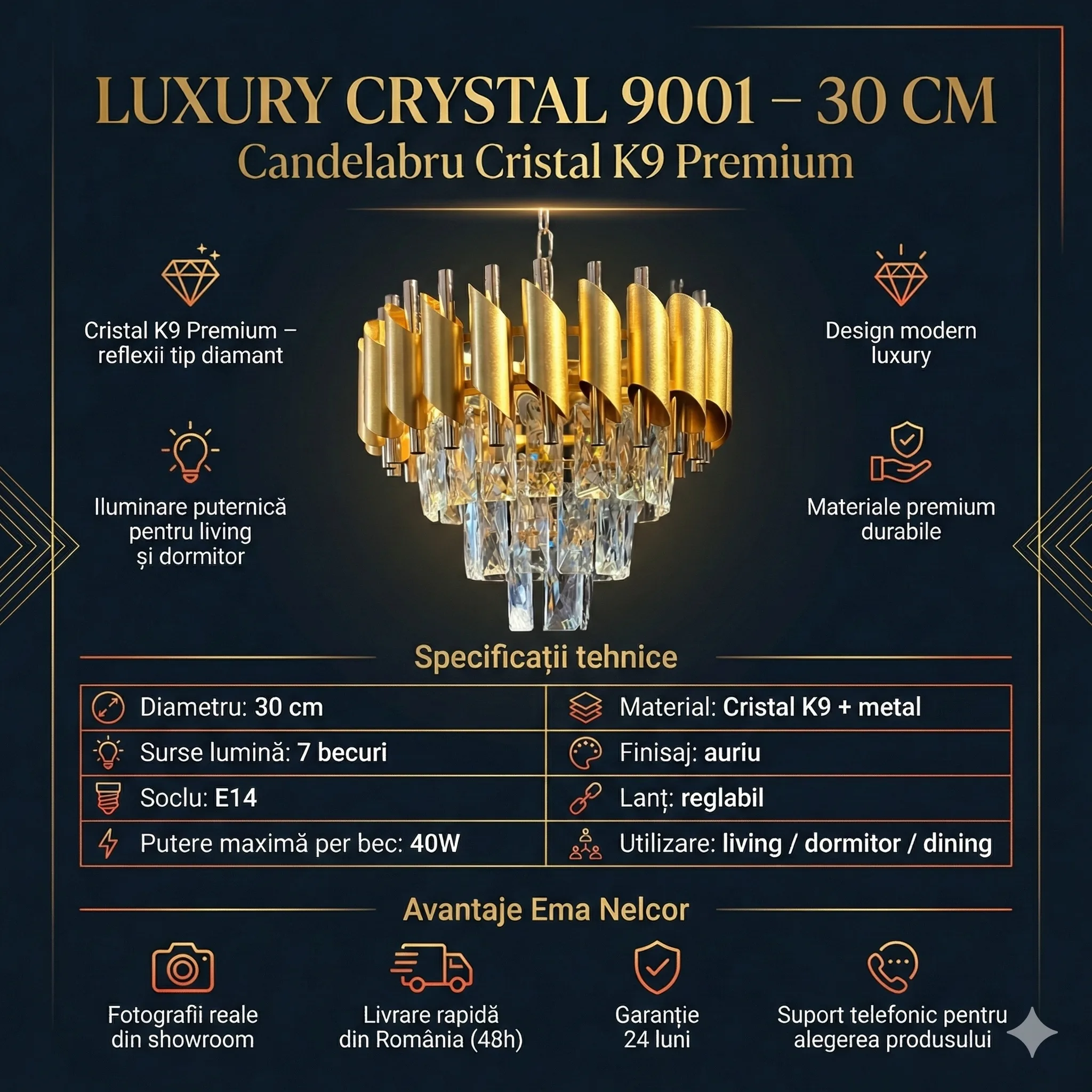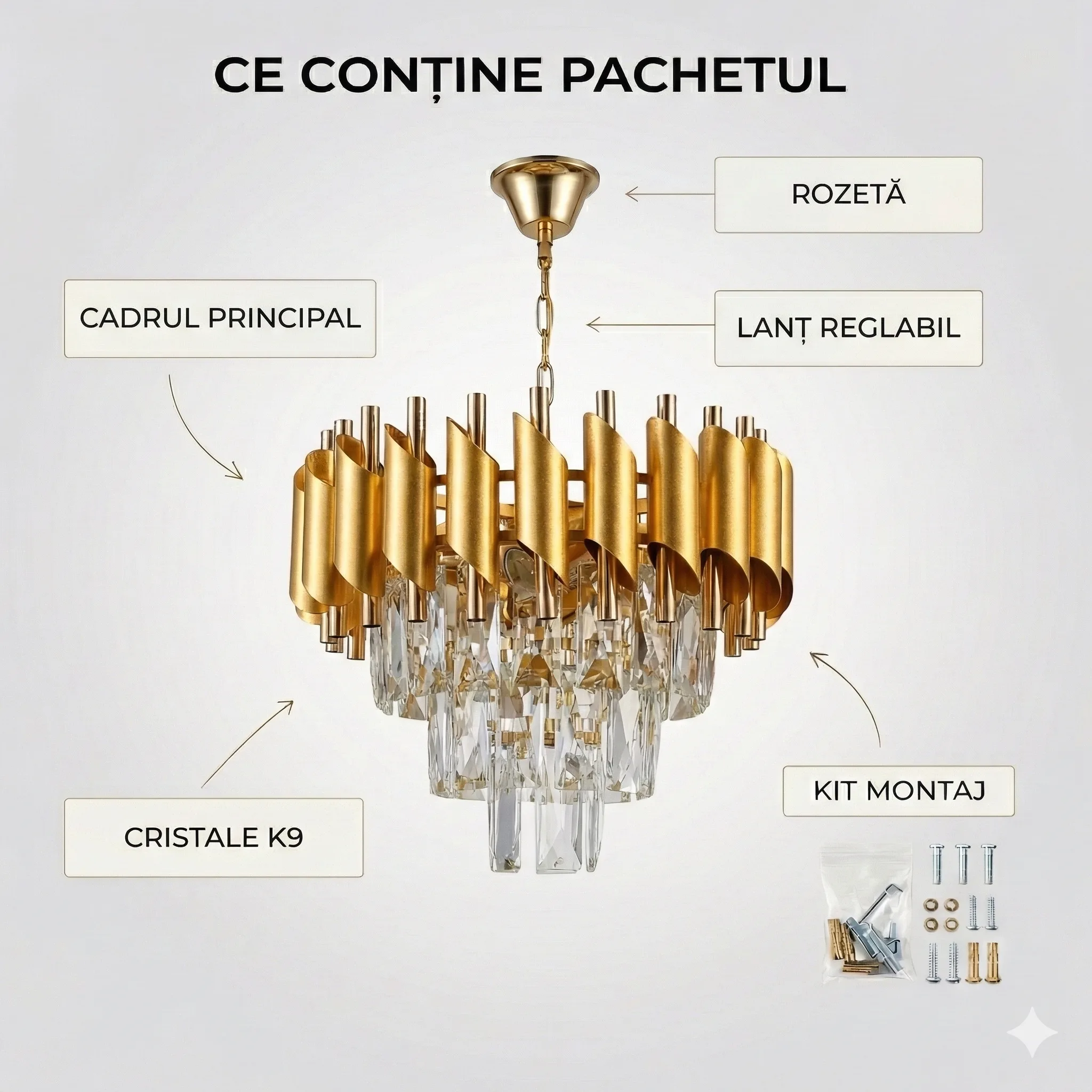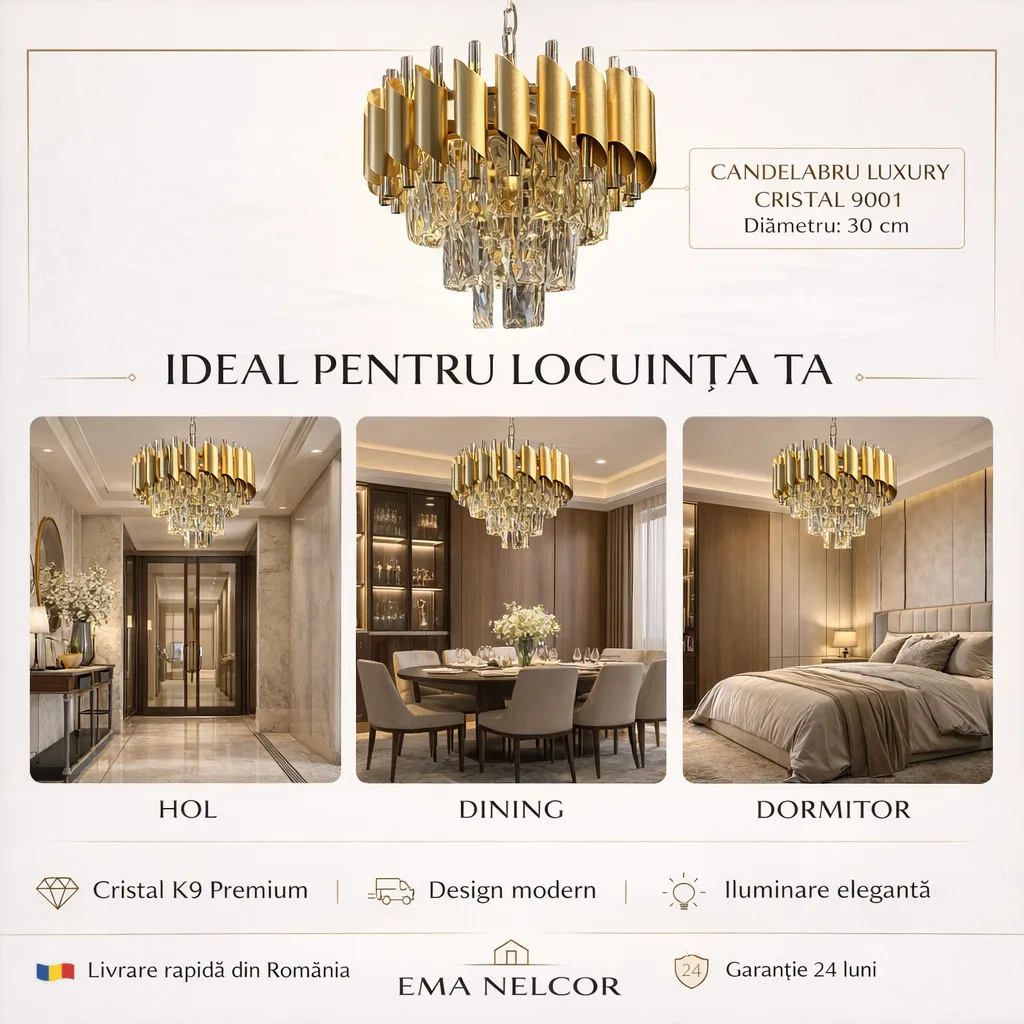 | Materiale de Lux | Cristal K9 & Oțel Auriu Satinat | Calitate premium care oferă reflexii clare și un luciu discret. |