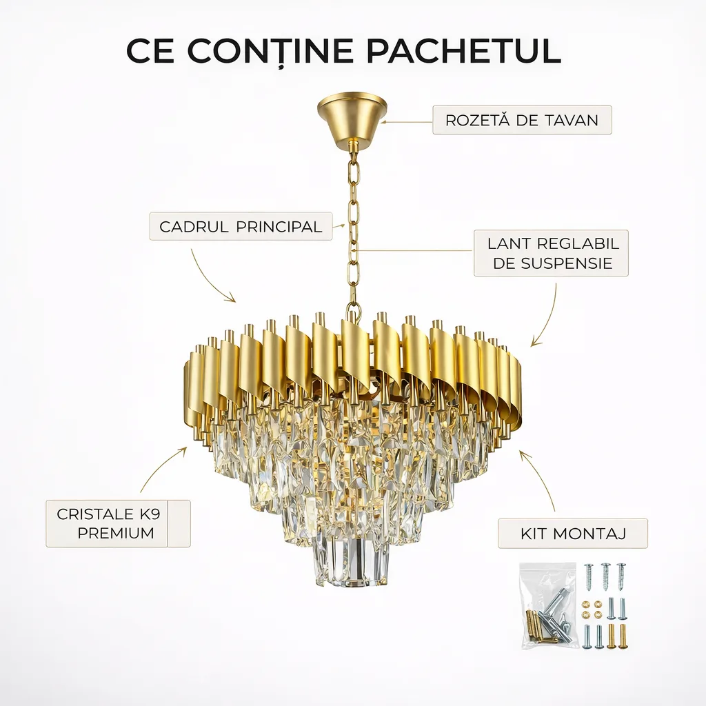 Pentru a ne asigura că produsul ajunge la tine în stare impecabilă, fără zgârieturi sau elemente deteriorate, livrăm această lustră în componente individuale, protejate profesional. Urmează acești pași simpli pentru o asamblare corectă și rapidă a structurii.