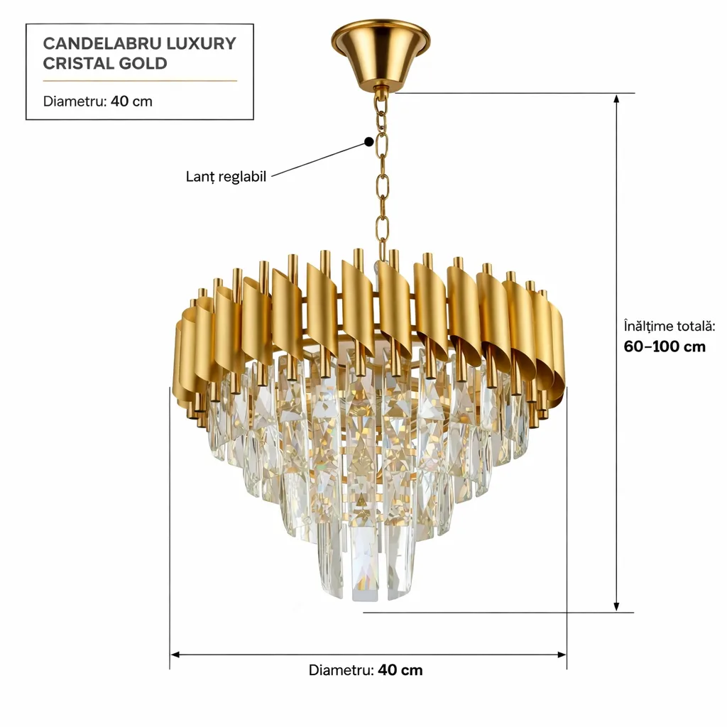 Este piesa ideală pentru cei care vor ca lustra să nu fie doar un obiect util, ci o declarație de stil. Cu o lățime de 40 cm, se potrivește de minune în dormitoare matrimoniale, sufragerii elegante sau deasupra unei mese de cafea, aducând acel „vibe” de hotel de 5 stele direct la tine în familie.
