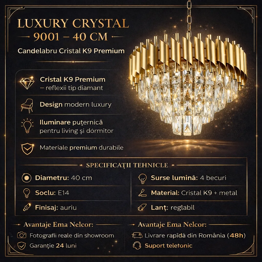 | Materiale de Lux | Cristal K9 & Oțel Auriu Satinat | Rezistență totală la oxidare și un luciu care persistă în timp. |