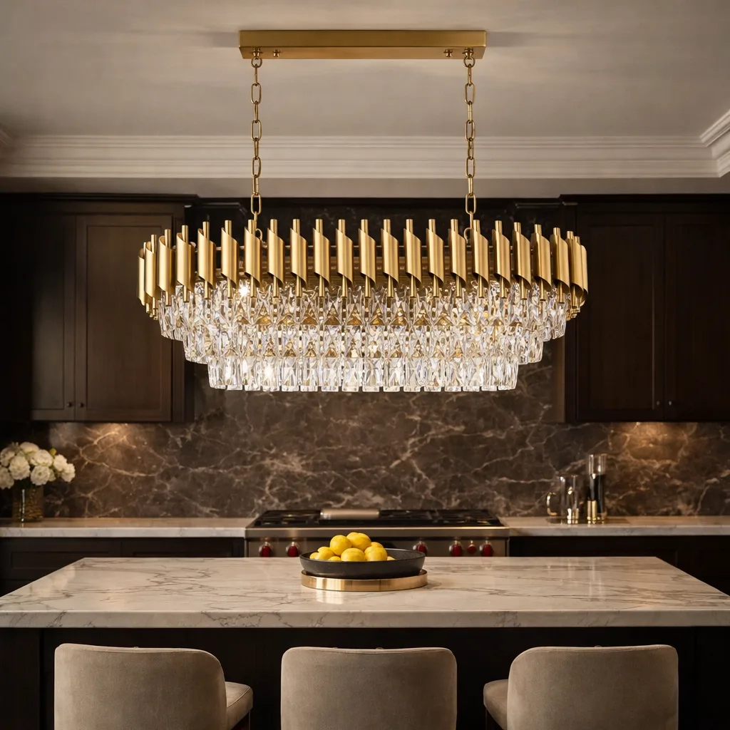 Cu o lungime impunătoare de 80 cm și dotat cu 8 surse de lumină, acest candelabru liniar este ideal pentru spații generoase, oferind o iluminare impecabilă deasupra meselor mari sau a insulelor de bucătărie de lux. Combinația dintre auriul cald al coroanei și puritatea cristalelor transparente creează o ambianță regală, potrivită pentru cele mai rafinate proiecte de design interior.