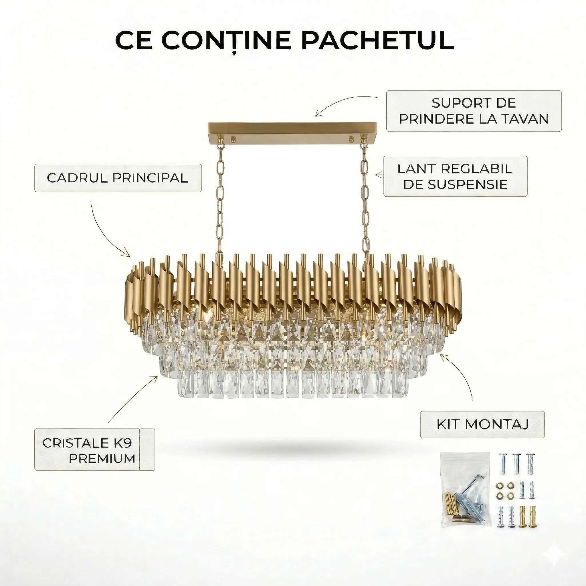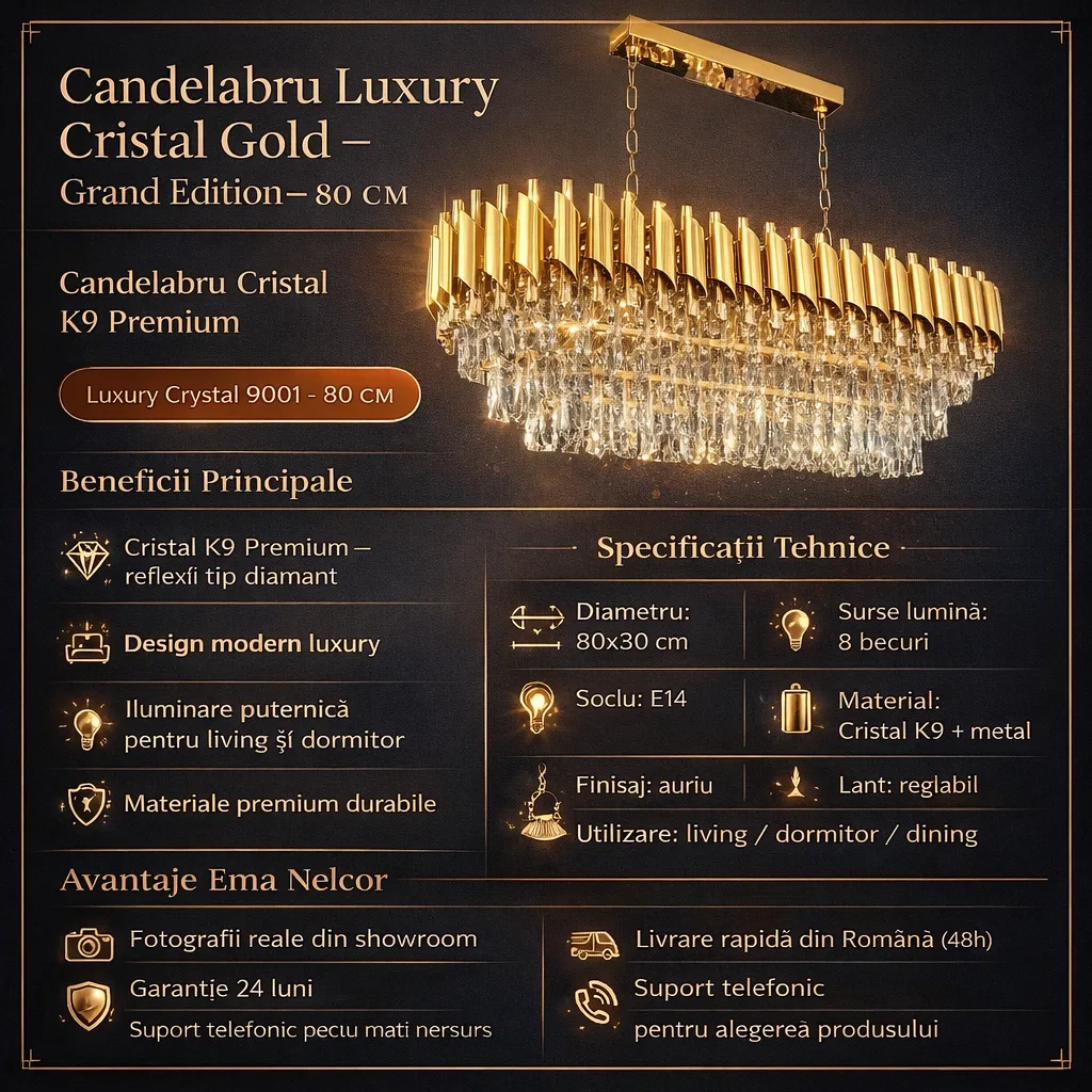| Materiale de Lux | Cristal K9 & Oțel Aurit Premium | Materiale nobile care își păstrează strălucirea în timp. |
