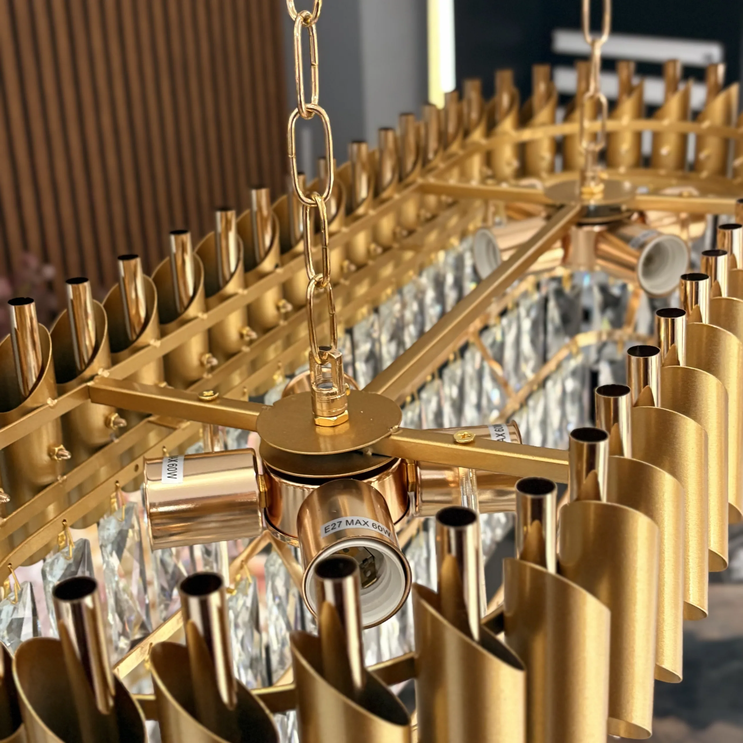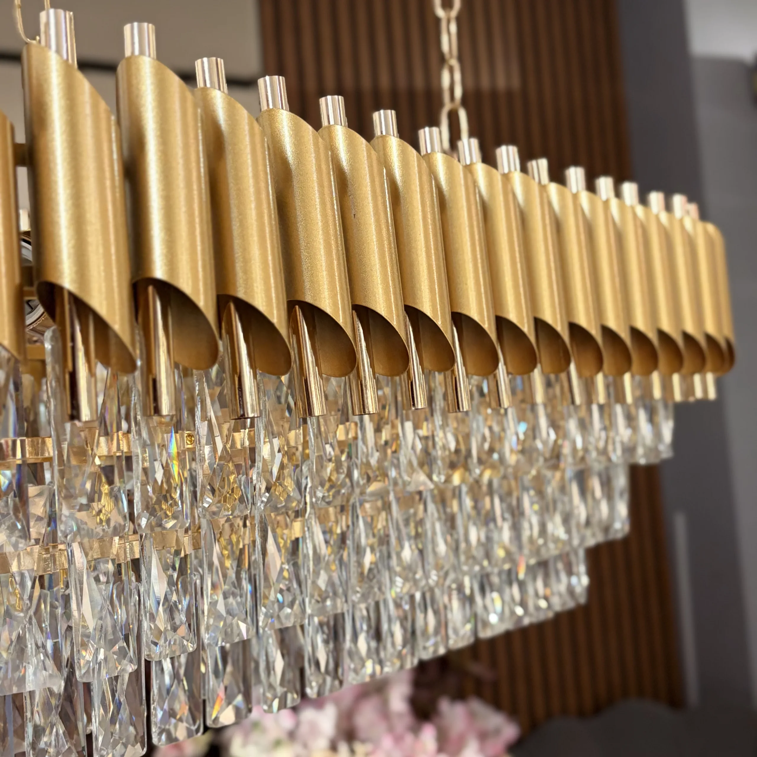 1. Prin ce se diferențiază acest model de „Modern Prism Gold”? În timp ce modelul Prism folosește lamele metalice drepte și rigide, Luxury Cristal Gold mizează pe elemente metalice curbate și suprapuse. Acest detaliu oferă candelabrului un aspect mai organic și mai sofisticat, fiind mai degrabă o „bijuterie” decât un obiect arhitectural.