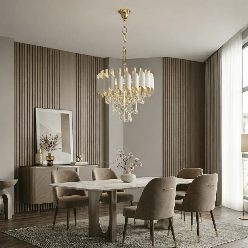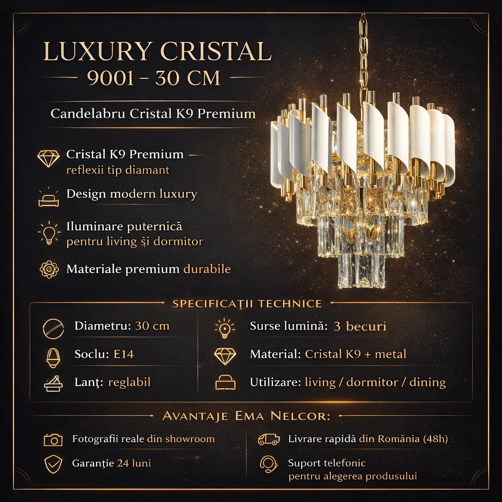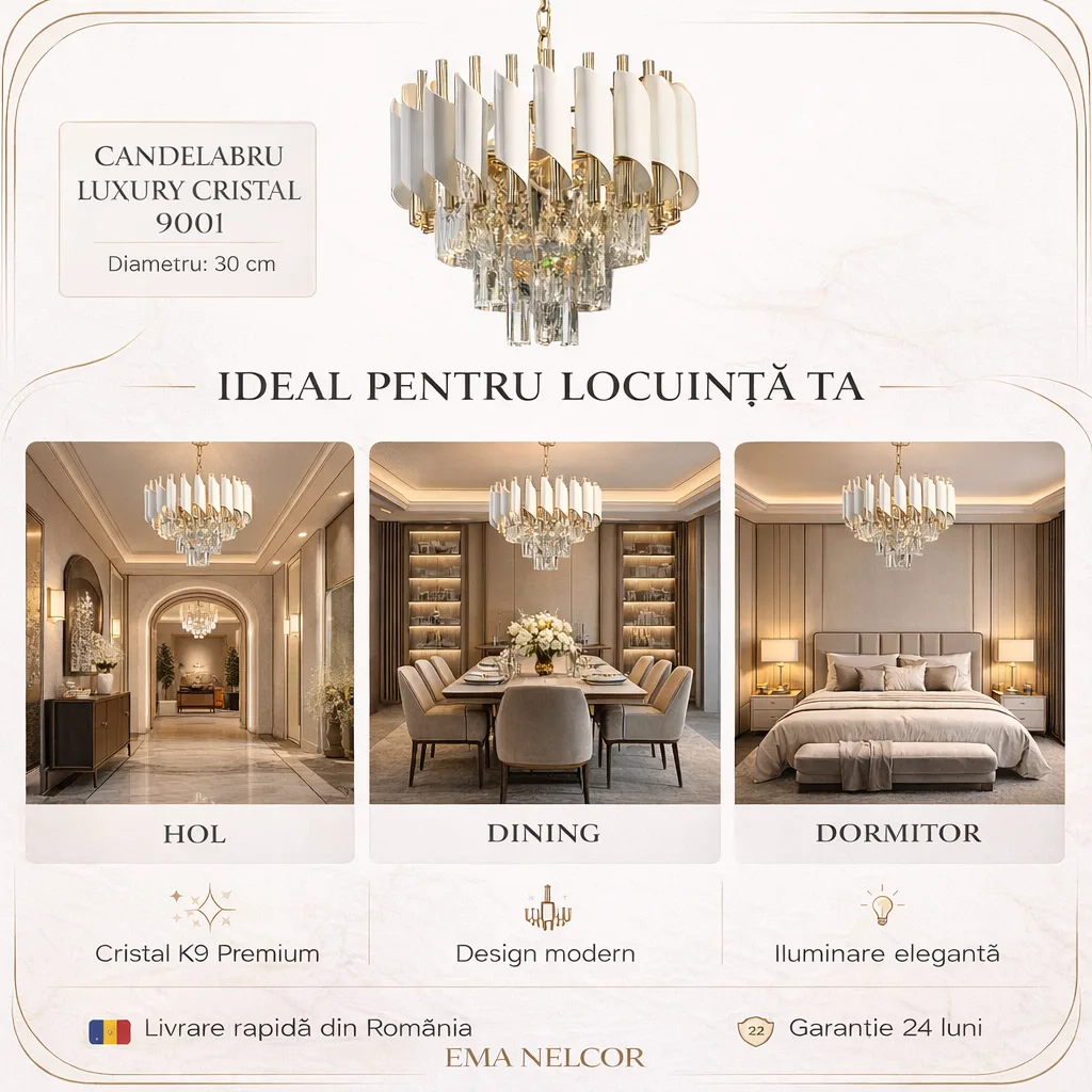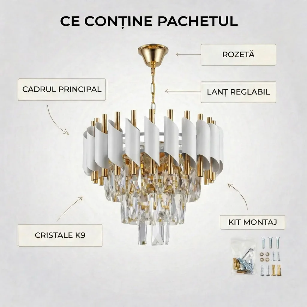 | Materiale de Lux | Cristal K9 & Oțel Alb Mat (Interior Auriu) | Aspect de revistă și materiale care nu se demodează. |
