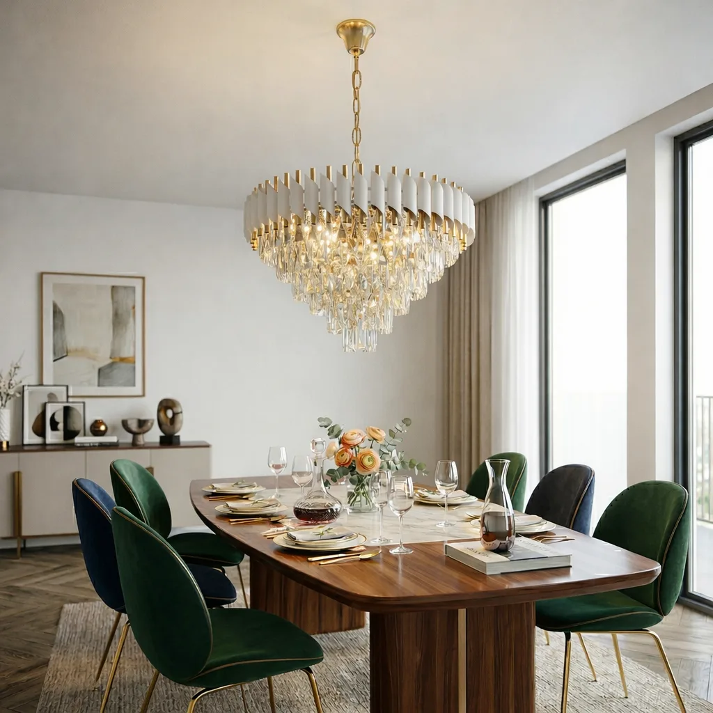 Contrastul dintre albul mat de la exterior și strălucirea „de diamant” a cascadelor de cristale K9 oferă o lumină bogată, care umple orice colț al camerei. Este alegerea perfectă dacă îți dorești un decor de lux care să inspire curățenie, prospețime și un gust estetic desăvârșit.
