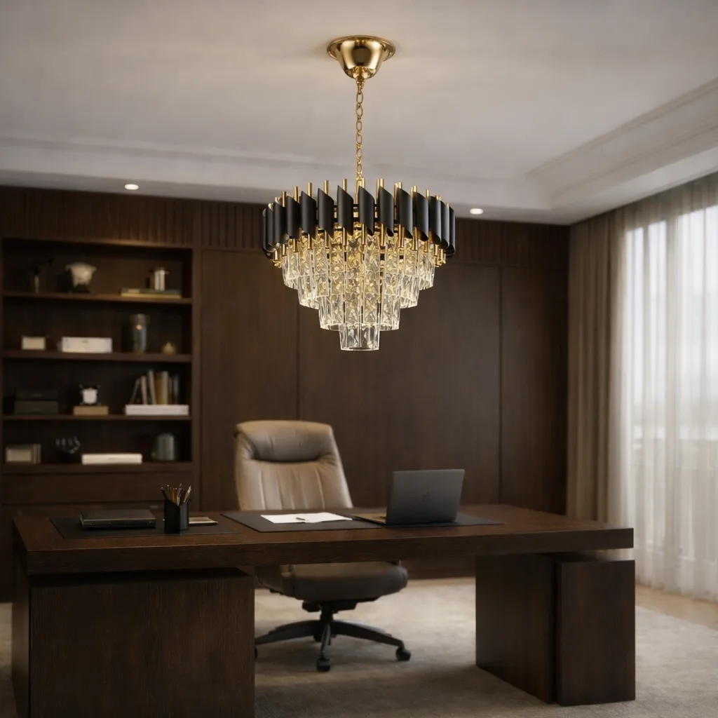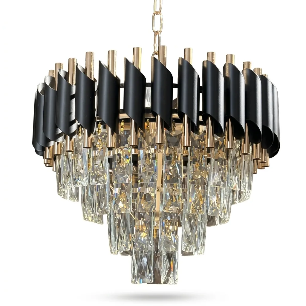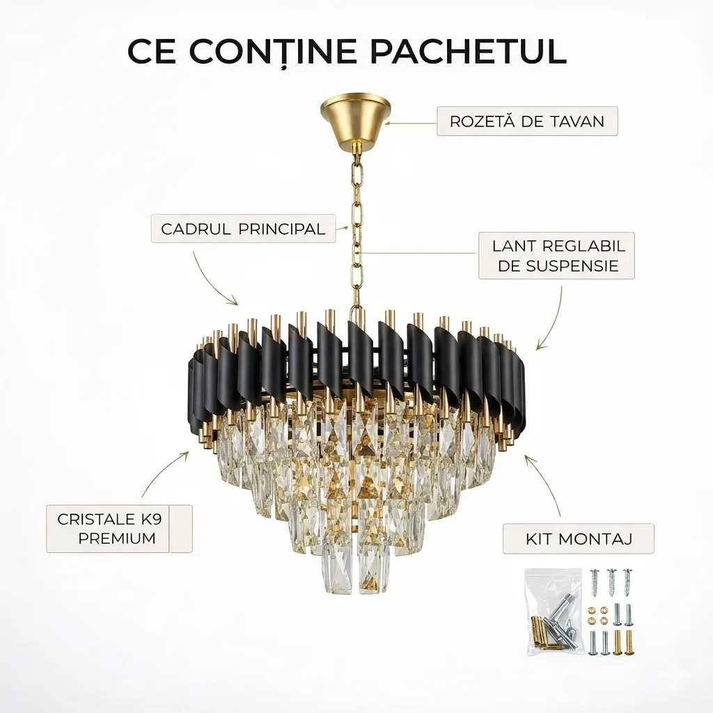 Candelabrul Luxury Cristal Black este definiția luxului modern cu un caracter puternic. Dacă varianta albă este luminoasă, iar cea aurie este opulentă, varianta pe negru este despre stil și dramatism vizual. Lamelele exterioare de un negru mat intens creează cadrul perfect pentru a scoate în evidență strălucirea cristalelor K9, oferind un contrast care atrage privirea imediat.
