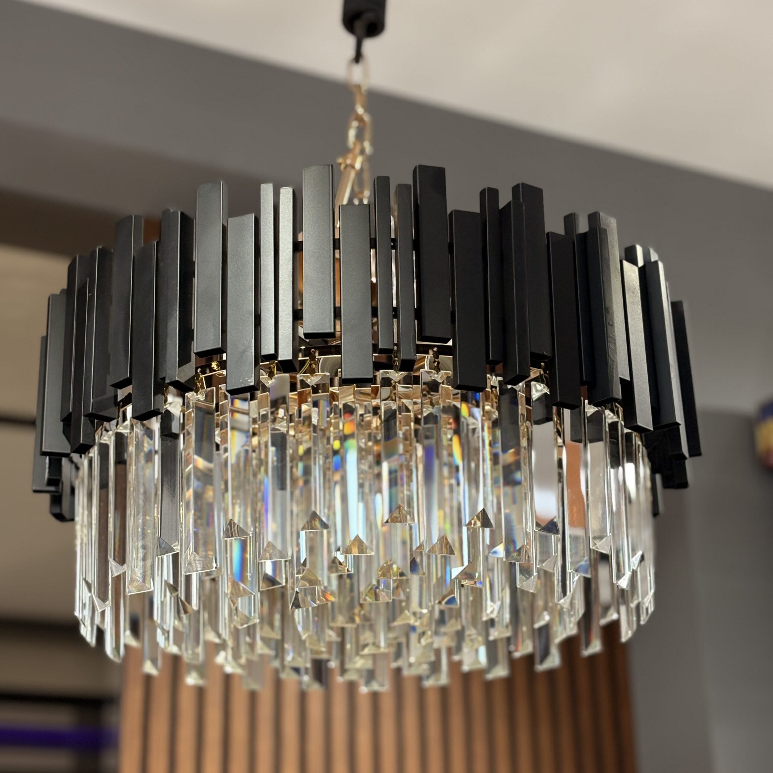 Candelabru modern cu structură metalică neagră și cristale fațetate K9, ideal pentru living, dining, dormitor sau hol. Design geometric elegant, cu linii verticale și lumină caldă, perfect pentru interioare contemporane și spații sofisticate.