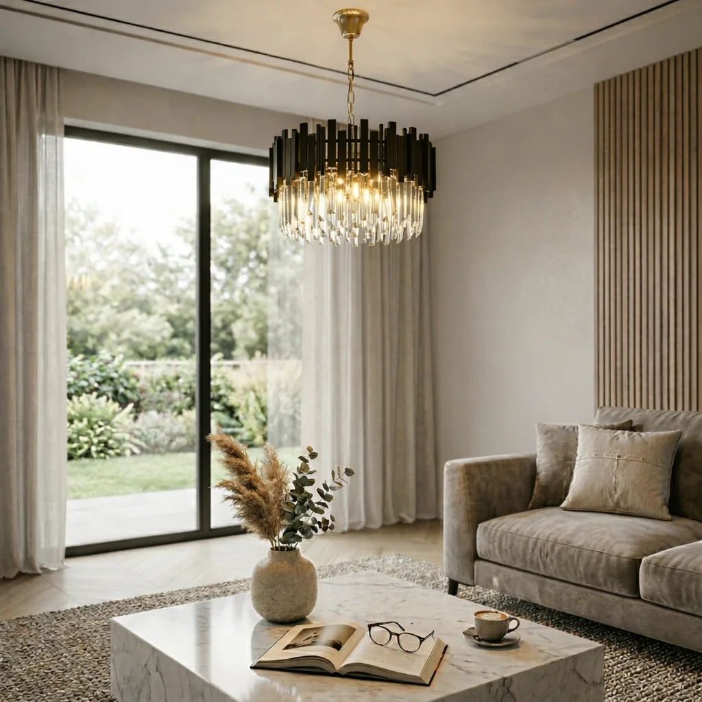 • Efecte de Lumină Dramatice: Cristalele rectangulare dispuse în straturi succesive filtrează lumina prin fantele negre, generând reflexii prismatice și un ambient sofisticat.