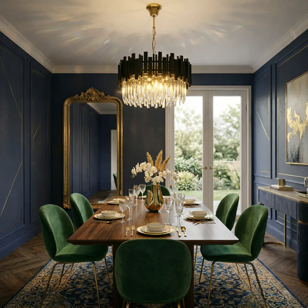 • Dining Room: Suspendată deasupra unei mese rotunde mari, creează decorul perfect pentru cine sofisticate.