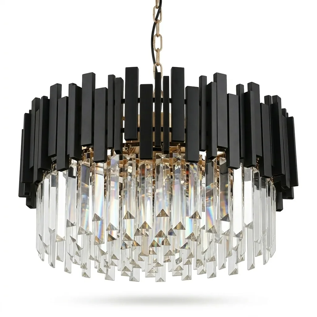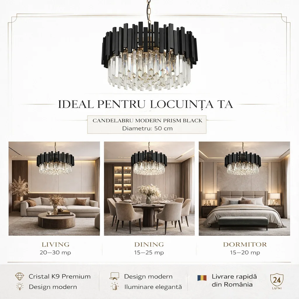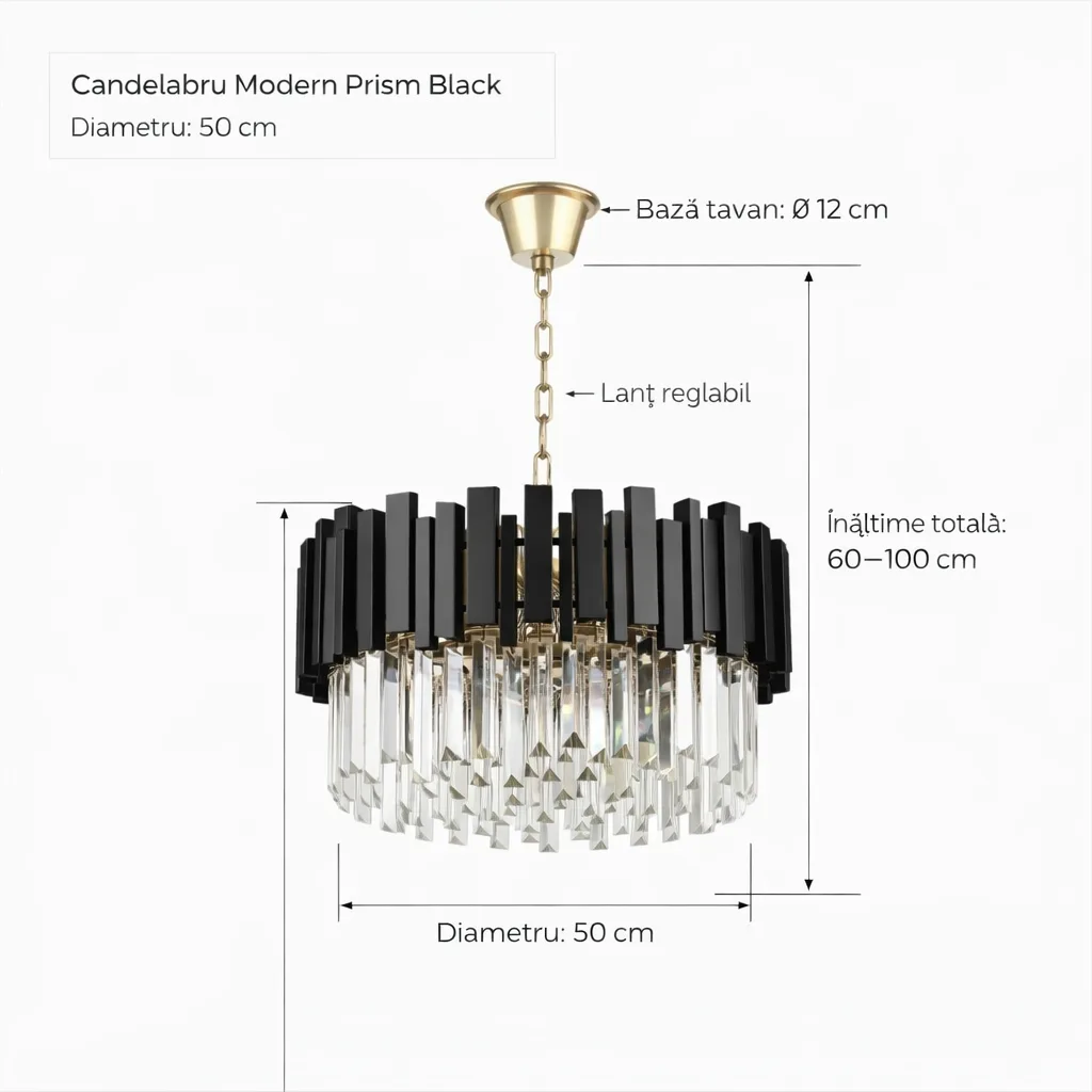 Candelabru Modern Prism Black 50 cm – Cristal K9 Premium Transparent și Metal Negru, 8 Becuri E14, Design Modern de Lux pentru Living și Dining