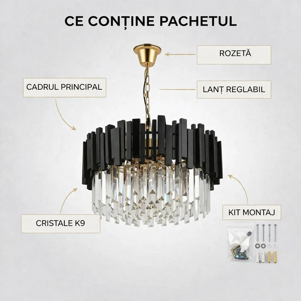 • Design Contrastant Puternic: Structura exterioară din baghete metalice negre, cu finisaj mat, creează un cadru geometric care pune în valoare strălucirea intensă a cristalelor interioare.