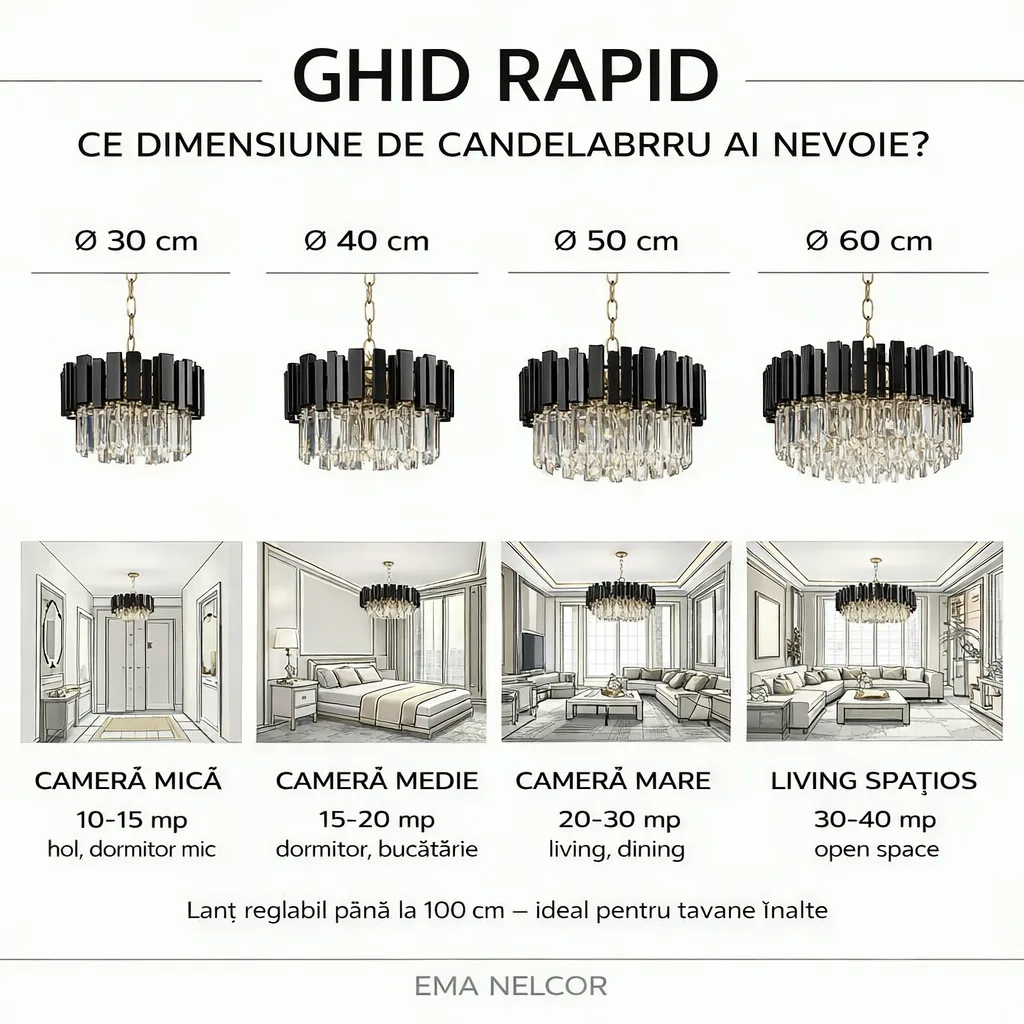 Pentru un aspect ultra-modern și tăios, recomandăm becuri LED cu lumină neutră (4000K). Dacă vrei să mai îndulcești contrastul negru-cristal, lumina caldă va crea o atmosferă mult mai intimă.