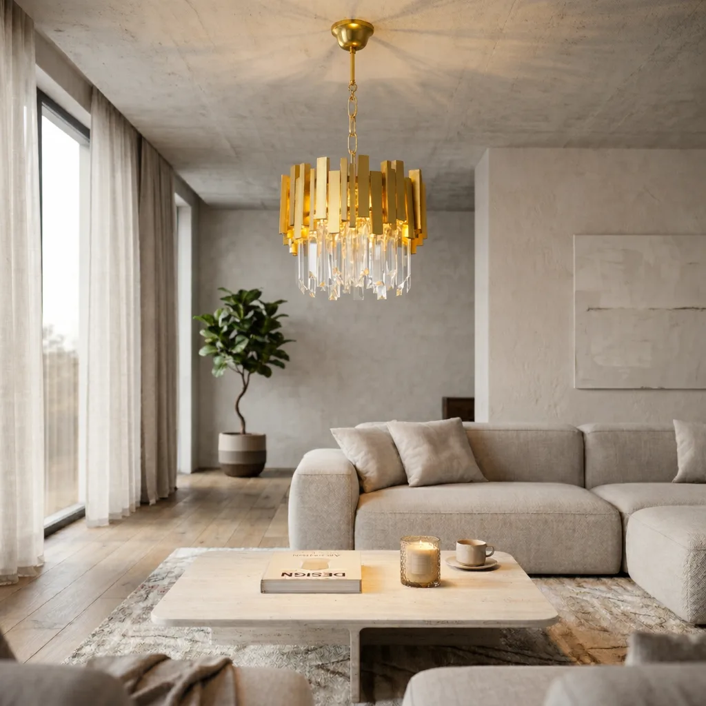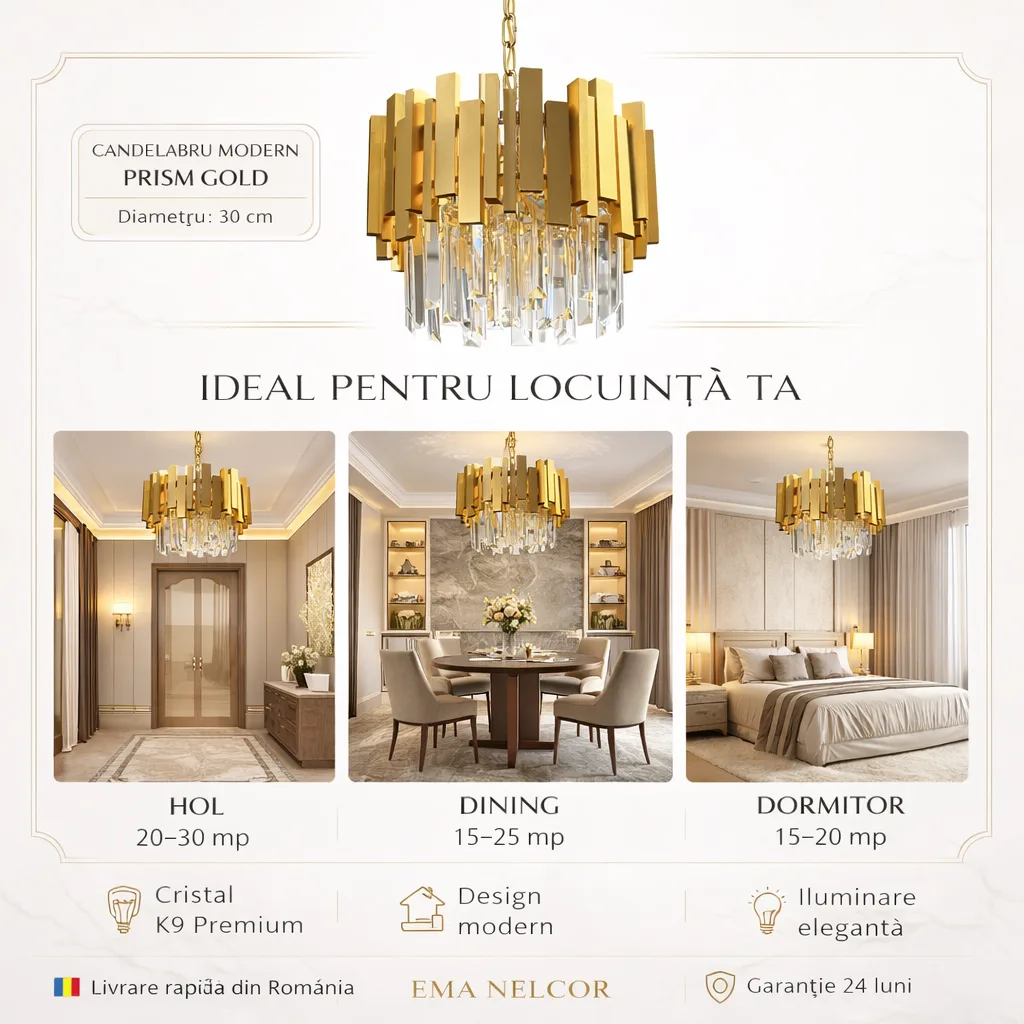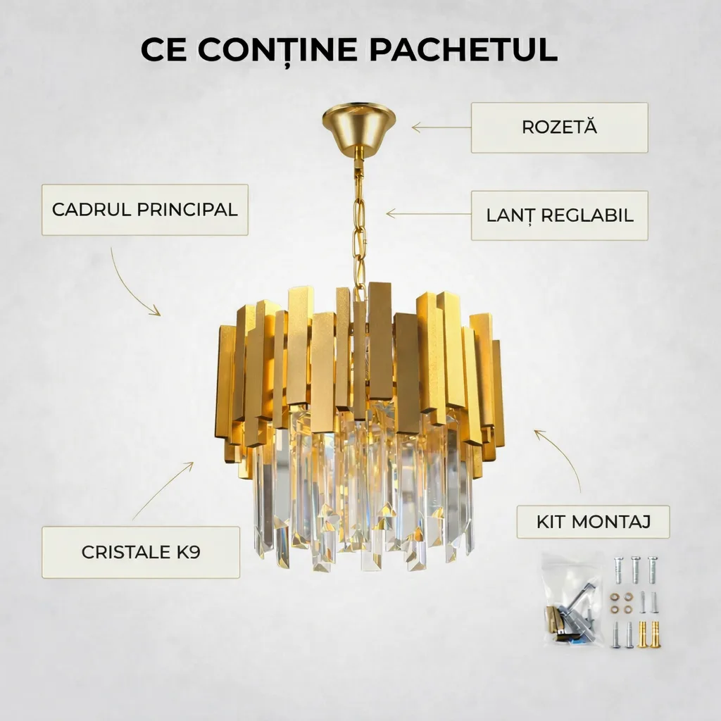 | Materiale de Lux | Cristal K9 & Oțel Auriu Mat | Calitate superioară a cristalului pentru reflexii maxime. |
