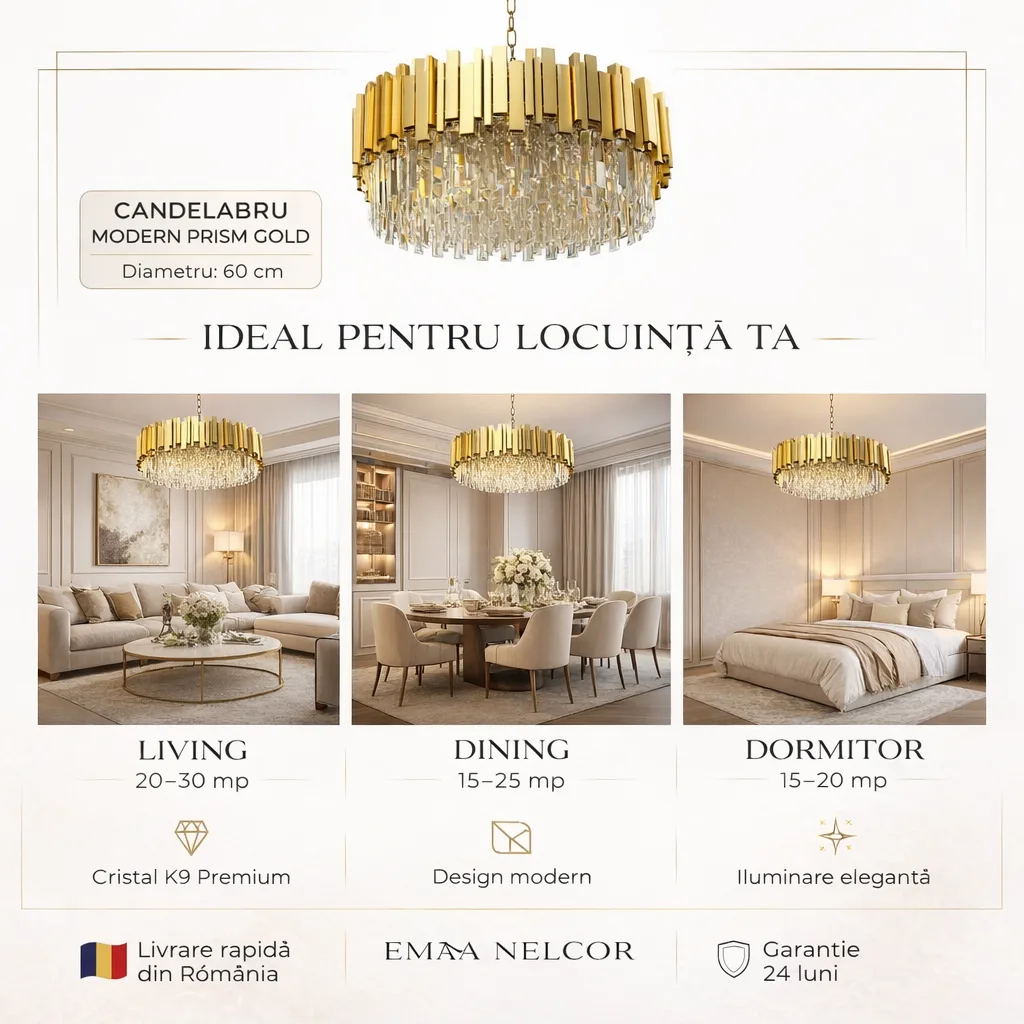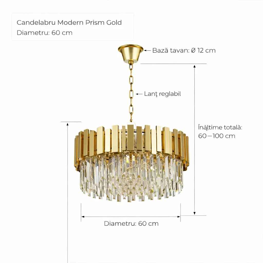 Candelabrul Modern Prism Gold 60 cm este definiția luxului contemporan la scară mare. Cu un diametru impresionant și nu mai puțin de 10 surse de lumină, acest model este proiectat să domine vizual și să transforme complet orice living spațios, vilă sau zonă de recepție. Prismele verticale din cristal K9 sunt dispuse dens pentru a capta fiecare rază de lumină, multiplicând-o într-un joc fascinant de reflexii aurii.