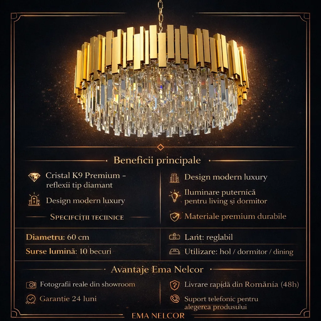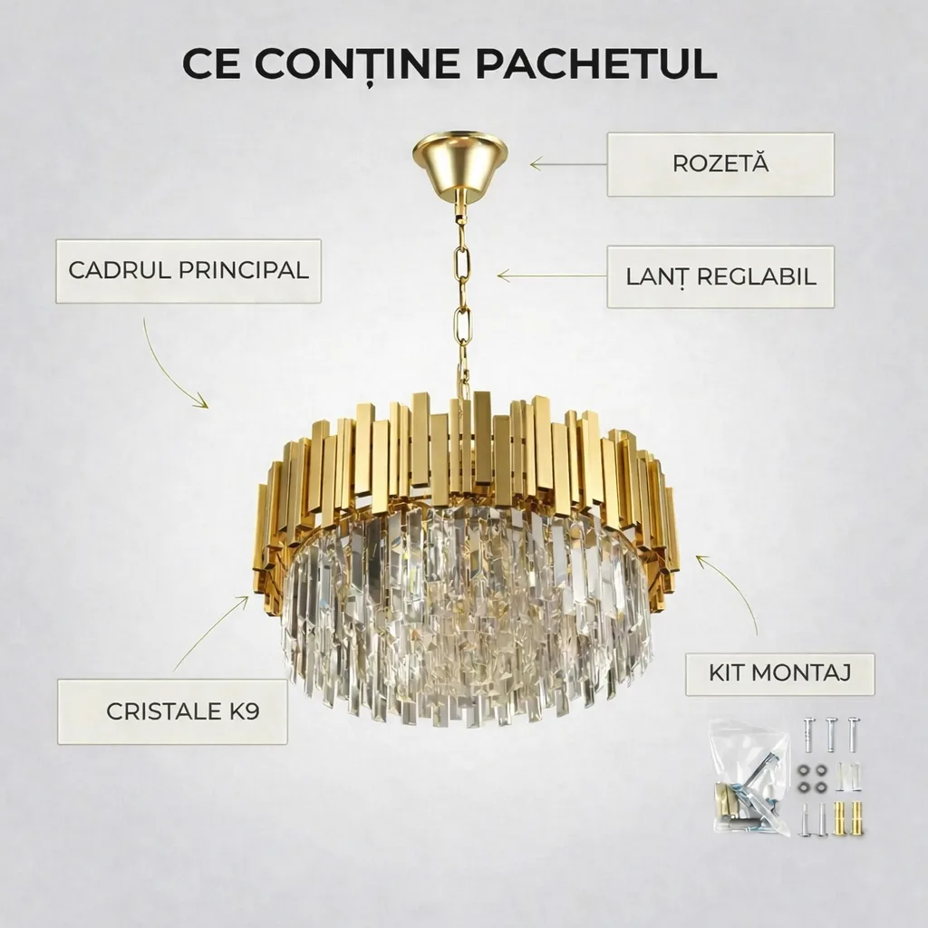 • Cristale K9 de înaltă densitate: Fiecare cristal este tăiat cu precizie pentru a asigura o dispersie uniformă a luminii și un joc de sclipiri prețioase.
