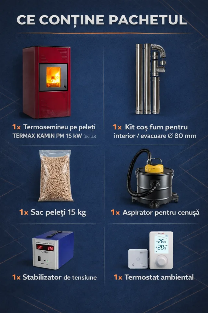 Pachet Termosemineu pe Peleți Termax Kamin PM 15 kW – pentru 120 mp, Buncăr 30 kg, Kit Complet