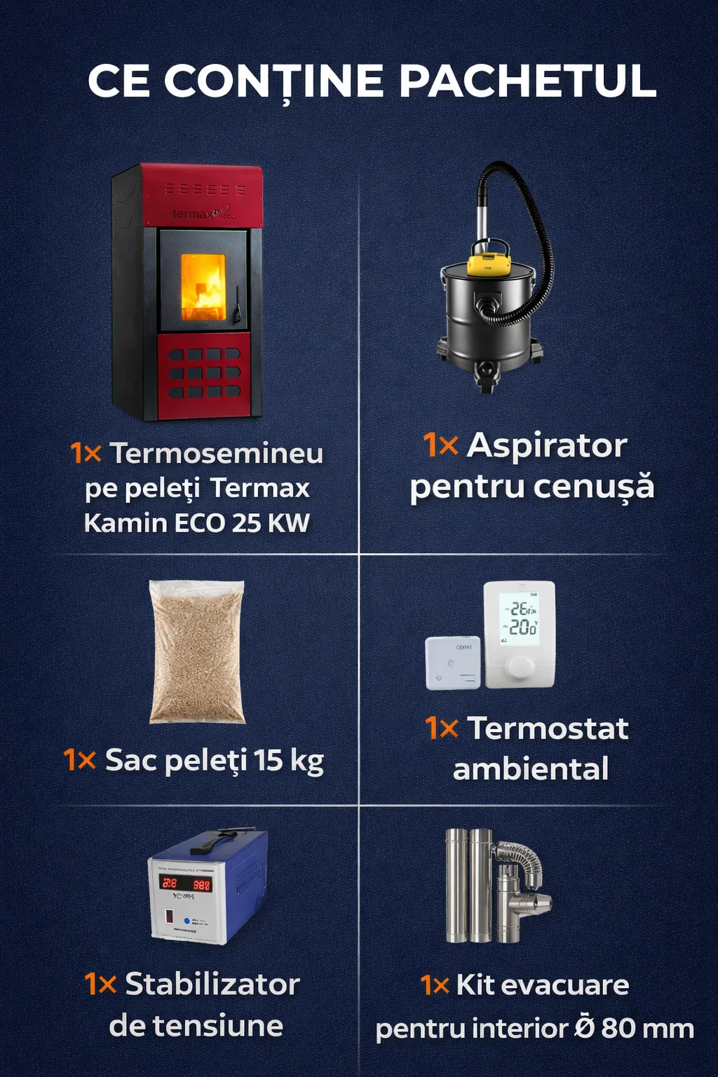 Pachet Termosemineu pe Peleți Termax Kamin Eco 25 kW – pentru 160 mp, Buncăr 45 kg, Kit Complet