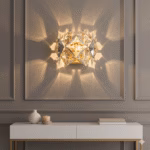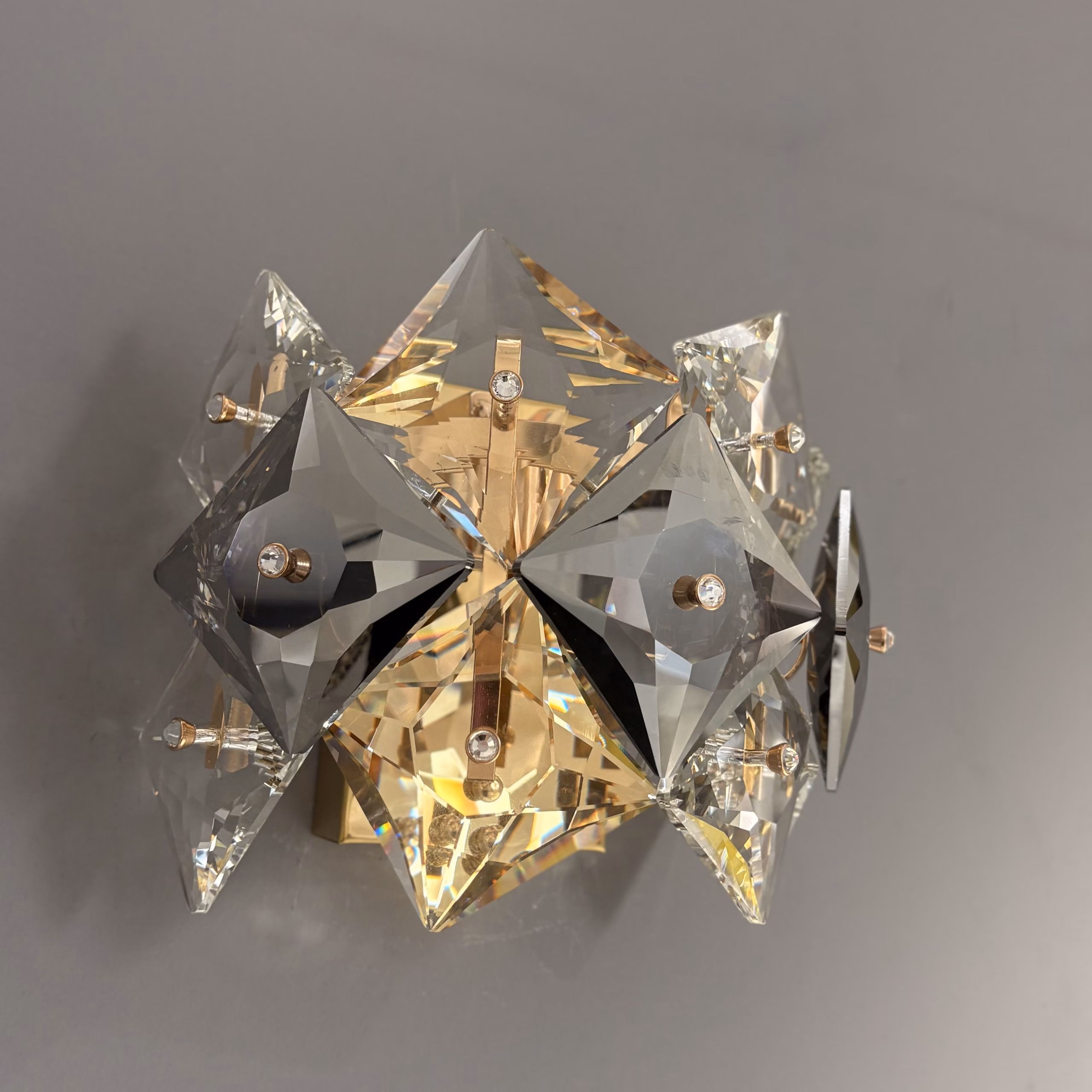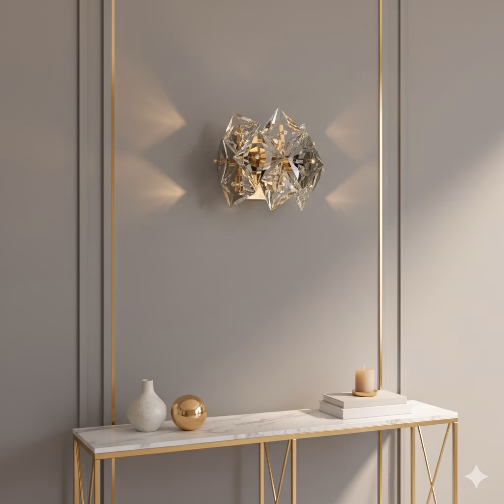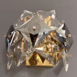 Aplică Diamond Smoke redefinește iluminatul decorativ prin volumul său tridimensional de cristale geometrice. Fiecare piesă este tăiată în formă de diamant, slefuită cu precizie pentru a crea un joc intens de reflexii, lumini calde și umbre rafinate. Nuanțele fumurii ale cristalelor se îmbină perfect cu montura metalică aurie, oferind un efect vizual sofisticat și modern.