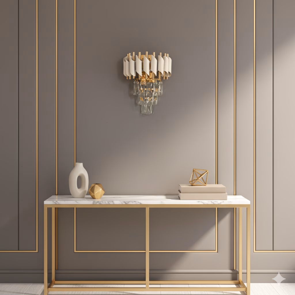 Aplică Luxury Crystal White este concepută pentru interioare care pun preț pe design, luminozitate și detalii premium. Structura alb mat, completată de accente aurii, creează un contrast elegant și modern. Cristalele K9, atent tăiate și dispuse în cascadă, reflectă lumina într-un mod spectaculos, aducând un plus de profunzime și textură vizuală.